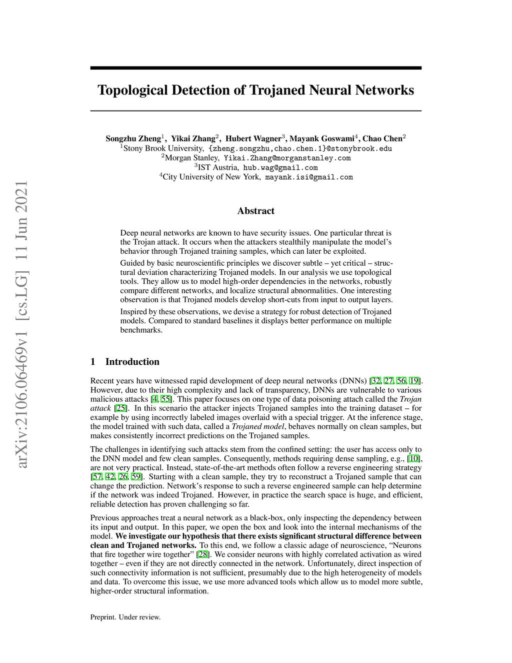 Deep neural networks are known to have security issues. One particular threat is the Trojan attack. It occurs when the attackers stealthily manipulate the model's behavior through Trojaned training samples, which can later be exploited. Guided by basic neuroscientific principles we discover subtle -- yet critical -- structural deviation characterizing Trojaned models. In our analysis we use topological tools. They allow us to model high-order dependencies in the networks, robustly compare different networks, and localize structural abnormalities. One interesting observation is that Trojaned models develop short-cuts from input to output layers. Inspired by these observations, we devise a strategy for robust detection of Trojaned models. Compared to standard baselines it displays better performance on multiple benchmarks.