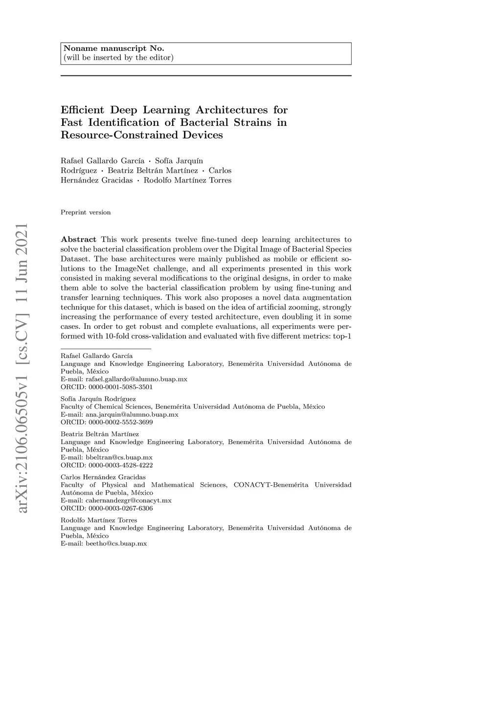 This work presents twelve fine-tuned deep learning architectures to solve the bacterial classification problem over the Digital Image of Bacterial Species Dataset. The base architectures were mainly published as mobile or efficient solutions to the ImageNet challenge, and all experiments presented in this work consisted of making several modifications to the original designs, in order to make them able to solve the bacterial classification problem by using fine-tuning and transfer learning techniques. This work also proposes a novel data augmentation technique for this dataset, which is based on the idea of artificial zooming, strongly increasing the performance of every tested architecture, even doubling it in some cases. In order to get robust and complete evaluations, all experiments were performed with 10-fold cross-validation and evaluated with five different metrics: top-1 and top-5 accuracy, precision, recall, and F1 score. This paper presents a complete comparison of the twelve different architectures, cross-validated with the original and the augmented version of the dataset, the results are also compared with several literature methods. Overall, eight of the eleven architectures surpassed the 0.95 scores in top-1 accuracy with our data augmentation method, being 0.9738 the highest top-1 accuracy. The impact of the data augmentation technique is reported with relative improvement scores.