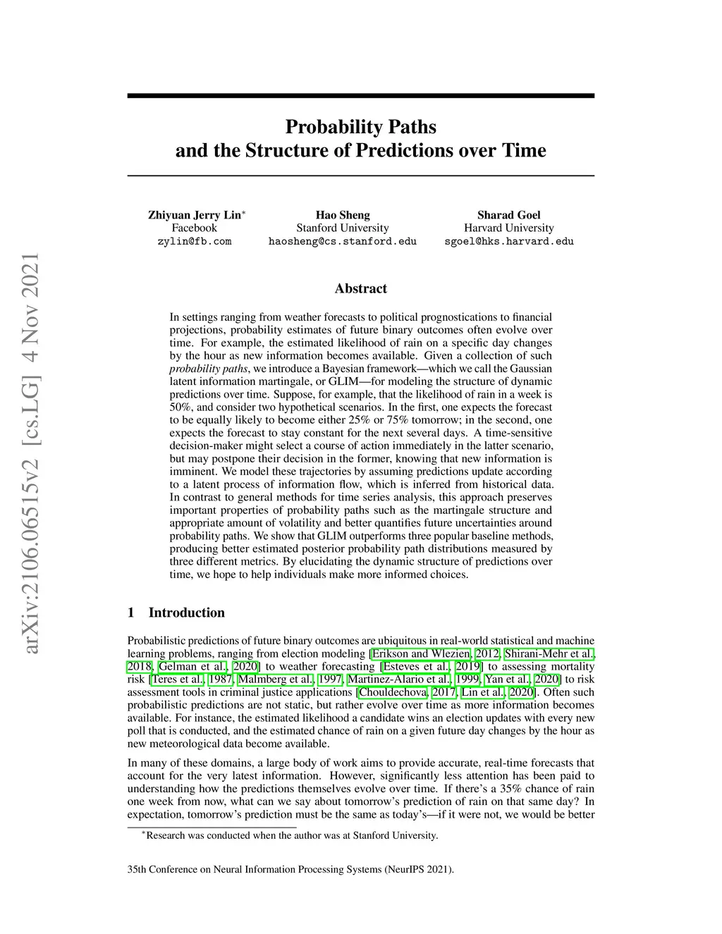 In settings ranging from weather forecasts to political prognostications to financial projections, probability estimates of future binary outcomes often evolve over time. For example, the estimated likelihood of rain on a specific day changes by the hour as new information becomes available. Given a collection of such probability paths, we introduce a Bayesian framework -- which we call the Gaussian latent information martingale, or GLIM -- for modeling the structure of dynamic predictions over time. Suppose, for example, that the likelihood of rain in a week is 50 %, and consider two hypothetical scenarios. In the first, one expects the forecast to be equally likely to become either 25 % or 75 % tomorrow; in the second, one expects the forecast to stay constant for the next several days. A time-sensitive decision-maker might select a course of action immediately in the latter scenario, but may postpone their decision in the former, knowing that new information is imminent. We model these trajectories by assuming predictions update according to a latent process of information flow, which is inferred from historical data. In contrast to general methods for time series analysis, this approach preserves important properties of probability paths such as the martingale structure and appropriate amount of volatility and better quantifies future uncertainties around probability paths. We show that GLIM outperforms three popular baseline methods, producing better estimated posterior probability path distributions measured by three different metrics. By elucidating the dynamic structure of predictions over time, we hope to help individuals make more informed choices.