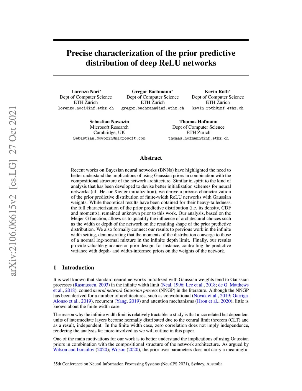 Recent works on Bayesian neural networks (BNNs) have highlighted the need to better understand the implications of using Gaussian priors in combination with the compositional structure of the network architecture. Similar in spirit to the kind of analysis that has been developed to devise better initialization schemes for neural networks (cf. He- or Xavier initialization), we derive a precise characterization of the prior predictive distribution of finite-width ReLU networks with Gaussian weights. While theoretical results have been obtained for their heavy-tailedness, the full characterization of the prior predictive distribution (i.e. its density, CDF and moments), remained unknown prior to this work. Our analysis, based on the Meijer-G function, allows us to quantify the influence of architectural choices such as the width or depth of the network on the resulting shape of the prior predictive distribution. We also formally connect our results to previous work in the infinite width setting, demonstrating that the moments of the distribution converge to those of a normal log-normal mixture in the infinite depth limit. Finally, our results provide valuable guidance on prior design: for instance, controlling the predictive variance with depth- and width-informed priors on the weights of the network.