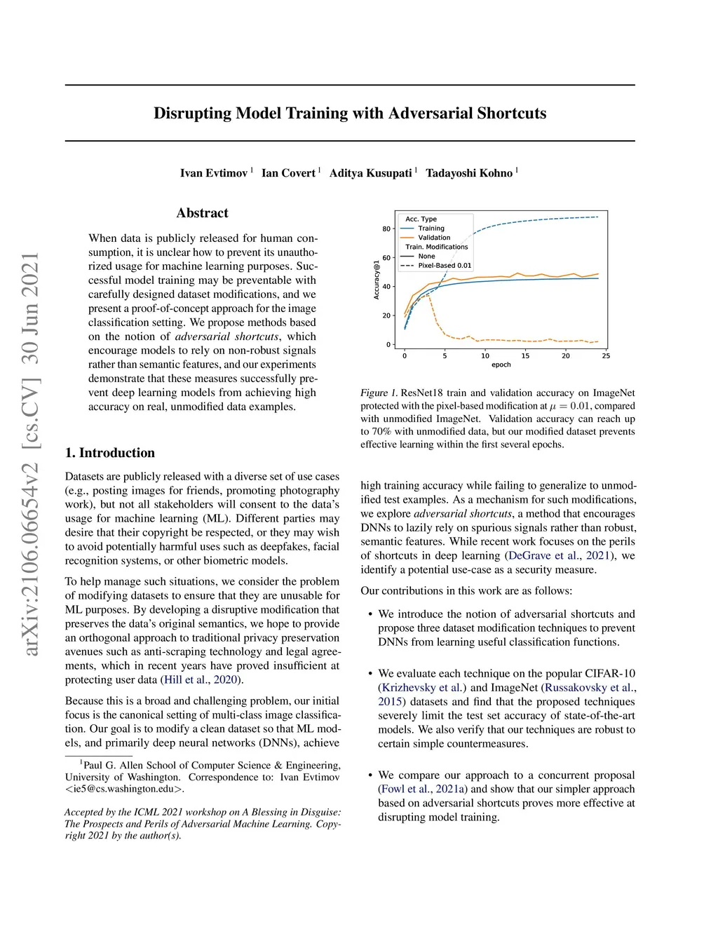 When data is publicly released for human consumption, it is unclear how to prevent its unauthorized usage for machine learning purposes. Successful model training may be preventable with carefully designed dataset modifications, and we present a proof-of-concept approach for the image classification setting. We propose methods based on the notion of adversarial shortcuts, which encourage models to rely on non-robust signals rather than semantic features, and our experiments demonstrate that these measures successfully prevent deep learning models from achieving high accuracy on real, unmodified data examples.