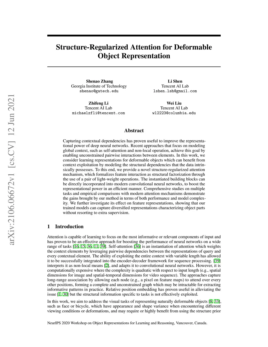 Capturing contextual dependencies has proven useful to improve the representational power of deep neural networks. Recent approaches that focus on modeling global context, such as self-attention and non-local operation, achieve this goal by enabling unconstrained pairwise interactions between elements. In this work, we consider learning representations for deformable objects which can benefit from context exploitation by modeling the structural dependencies that the data intrinsically possesses. To this end, we provide a novel structure-regularized attention mechanism, which formalizes feature interaction as structural factorization through the use of a pair of light-weight operations. The instantiated building blocks can be directly incorporated into modern convolutional neural networks, to boost the representational power in an efficient manner. Comprehensive studies on multiple tasks and empirical comparisons with modern attention mechanisms demonstrate the gains brought by our method in terms of both performance and model complexity. We further investigate its effect on feature representations, showing that our trained models can capture diversified representations characterizing object parts without resorting to extra supervision.