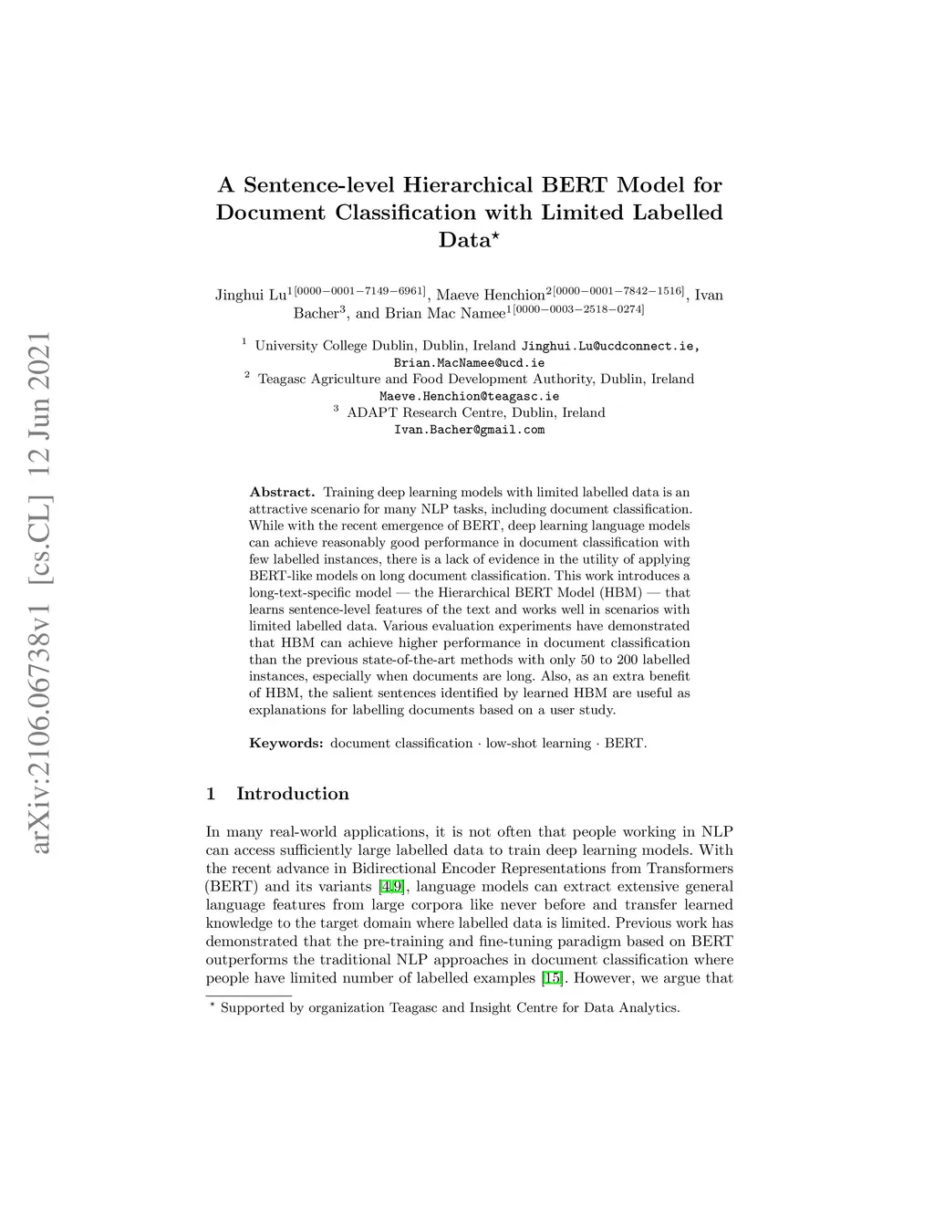 Training deep learning models with limited labelled data is an attractive scenario for many NLP tasks, including document classification. While with the recent emergence of BERT, deep learning language models can achieve reasonably good performance in document classification with few labelled instances, there is a lack of evidence in the utility of applying BERT-like models on long document classification. This work introduces a long-text-specific model -- the Hierarchical BERT Model (HBM) -- that learns sentence-level features of the text and works well in scenarios with limited labelled data. Various evaluation experiments have demonstrated that HBM can achieve higher performance in document classification than the previous state-of-the-art methods with only 50 to 200 labelled instances, especially when documents are long. Also, as an extra benefit of HBM, the salient sentences identified by learned HBM are useful as explanations for labelling documents based on a user study.