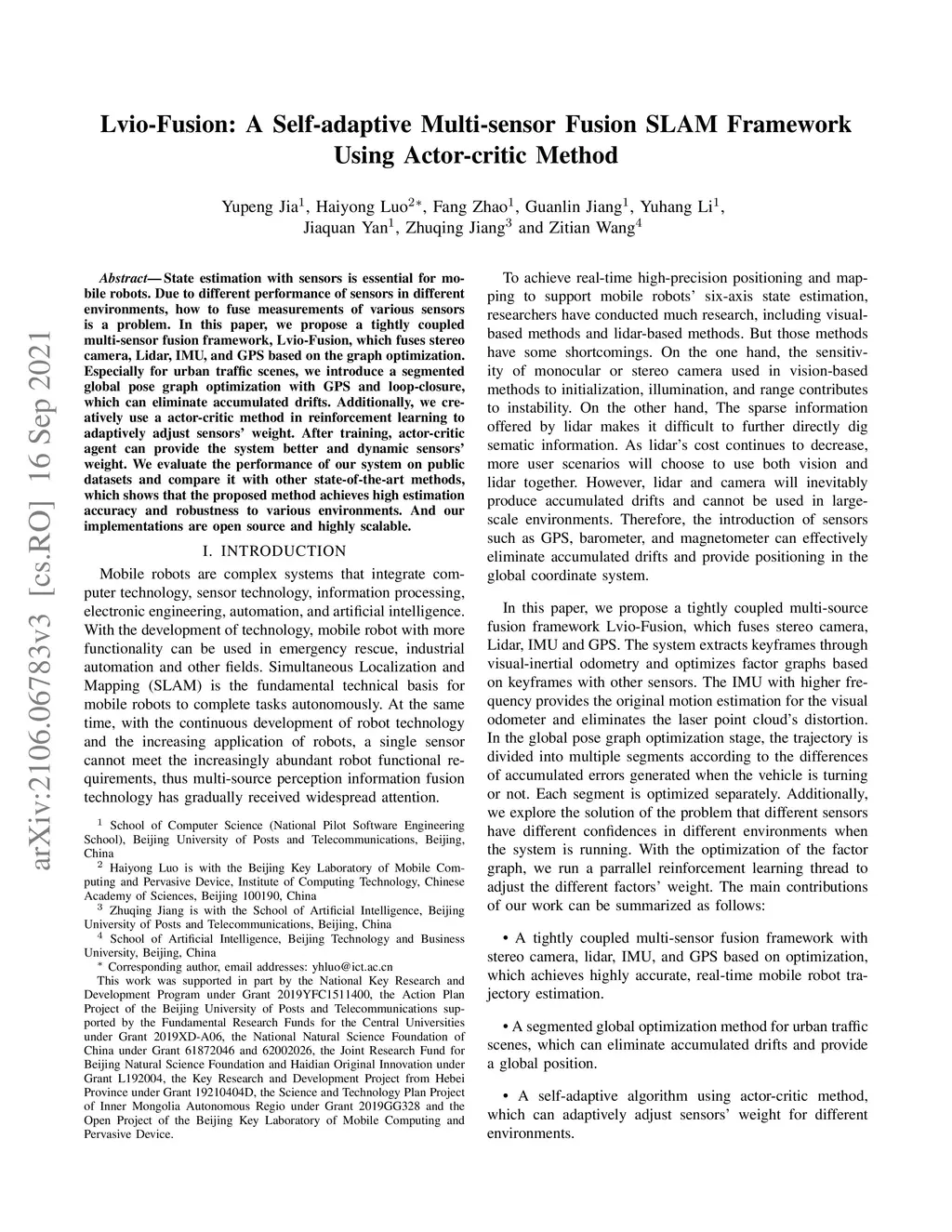 State estimation with sensors is essential for mobile robots. Due to different performance of sensors in different environments, how to fuse measurements of various sensors is a problem. In this paper, we propose a tightly coupled multi-sensor fusion framework, Lvio-Fusion, which fuses stereo camera, Lidar, IMU, and GPS based on the graph optimization. Especially for urban traffic scenes, we introduce a segmented global pose graph optimization with GPS and loop-closure, which can eliminate accumulated drifts. Additionally, we creatively use a actor-critic method in reinforcement learning to adaptively adjust sensors' weight. After training, actor-critic agent can provide the system better and dynamic sensors' weight. We evaluate the performance of our system on public datasets and compare it with other state-of-the-art methods, which shows that the proposed method achieves high estimation accuracy and robustness to various environments. And our implementations are open source and highly scalable.
