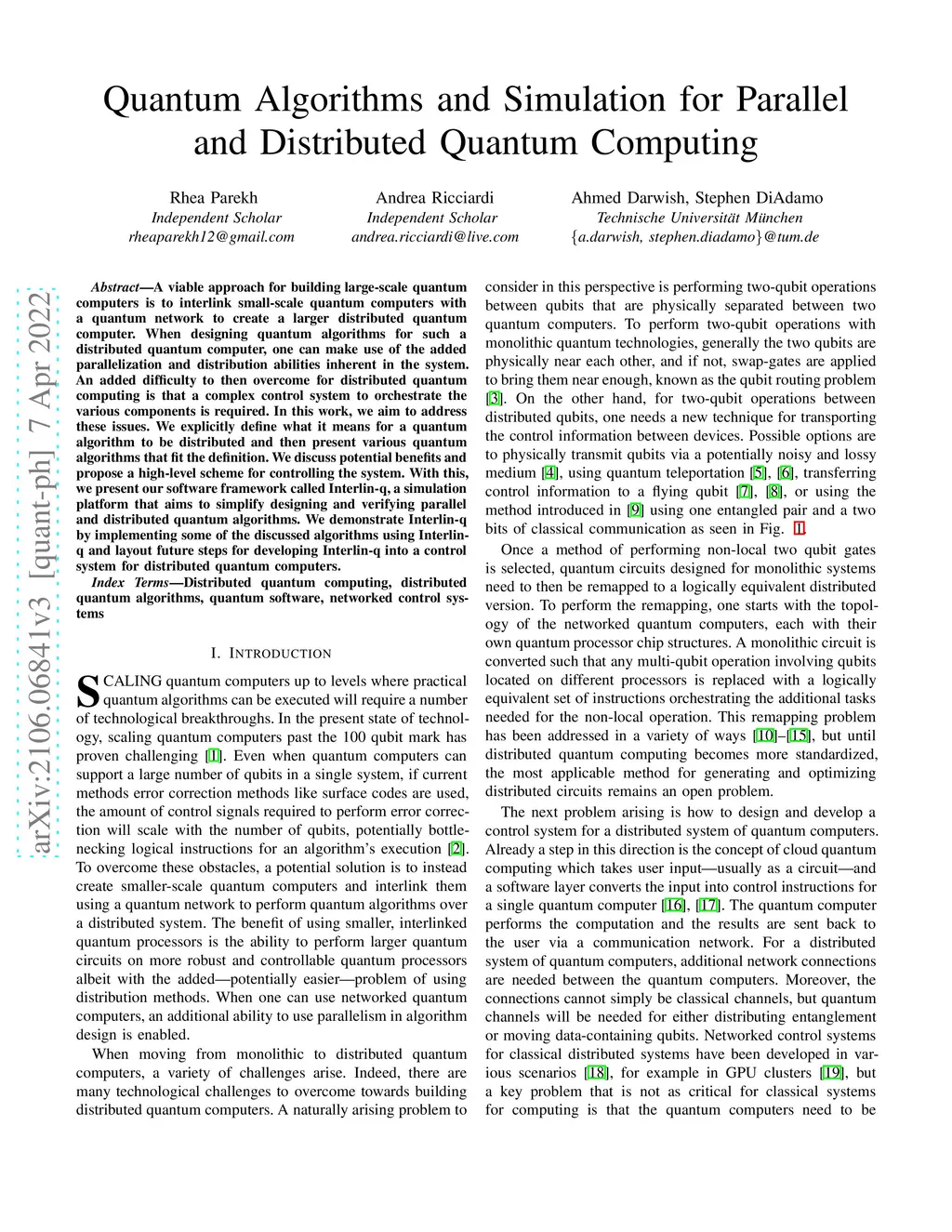 A viable approach for building large-scale quantum computers is to interlink small-scale quantum computers with a quantum network to create a larger distributed quantum computer. When designing quantum algorithms for such a distributed quantum computer, one can make use of the added parallelization and distribution abilities inherent in the system. An added difficulty to then overcome for distributed quantum computing is that a complex control system to orchestrate the various components is required. In this work, we aim to address these issues. We explicitly define what it means for a quantum algorithm to be distributed and then present various quantum algorithms that fit the definition. We discuss potential benefits and propose a high-level scheme for controlling the system. With this, we present our software framework called Interlin-q, a simulation platform that aims to simplify designing and verifying parallel and distributed quantum algorithms. We demonstrate Interlin-q by implementing some of the discussed algorithms using Interlin-q and layout future steps for developing Interlin-q into a control system for distributed quantum computers.