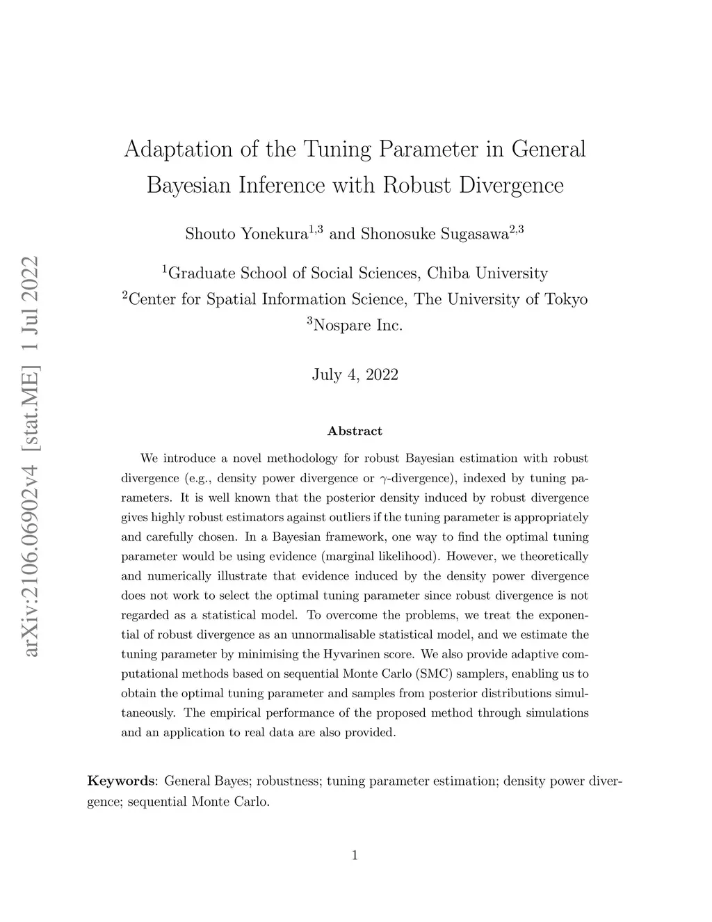 We introduce a methodology for robust Bayesian estimation with robust divergence (e.g., density power divergence or {\gamma}-divergence), indexed by a single tuning parameter. It is well known that the posterior density induced by robust divergence gives highly robust estimators against outliers if the tuning parameter is appropriately and carefully chosen. In a Bayesian framework, one way to find the optimal tuning parameter would be using evidence (marginal likelihood). However, we numerically illustrate that evidence induced by the density power divergence does not work to select the optimal tuning parameter since robust divergence is not regarded as a statistical model. To overcome the problems, we treat the exponential of robust divergence as an unnormalized statistical model, and we estimate the tuning parameter via minimizing the Hyvarinen score. We also provide adaptive computational methods based on sequential Monte Carlo (SMC) samplers, which enables us to obtain the optimal tuning parameter and samples from posterior distributions simultaneously. The empirical performance of the proposed method through simulations and an application to real data are also provided.
