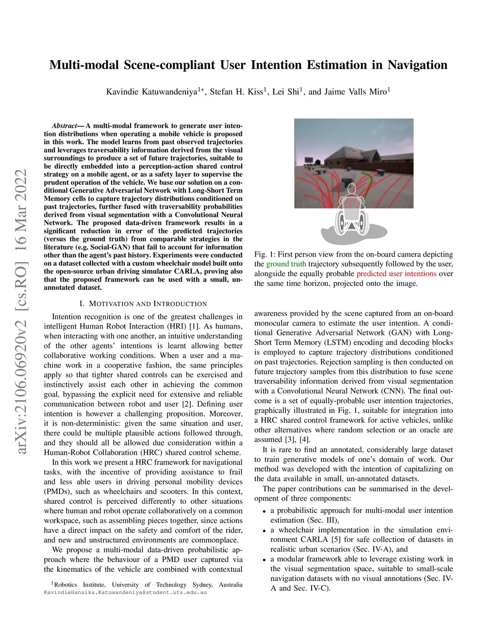 A multi-modal framework to generate user intention distributions when operating a mobile vehicle is proposed in this work. The model learns from past observed trajectories and leverages traversability information derived from the visual surroundings to produce a set of future trajectories, suitable to be directly embedded into a perception-action shared control strategy on a mobile agent, or as a safety layer to supervise the prudent operation of the vehicle. We base our solution on a conditional Generative Adversarial Network with Long-Short Term Memory cells to capture trajectory distributions conditioned on past trajectories, further fused with traversability probabilities derived from visual segmentation with a Convolutional Neural Network. The proposed data-driven framework results in a significant reduction in error of the predicted trajectories (versus the ground truth) from comparable strategies in the literature (e.g. Social-GAN) that fail to account for information other than the agent's past history. Experiments were conducted on a dataset collected with a custom wheelchair model built onto the open-source urban driving simulator CARLA, proving also that the proposed framework can be used with a small, un-annotated dataset.