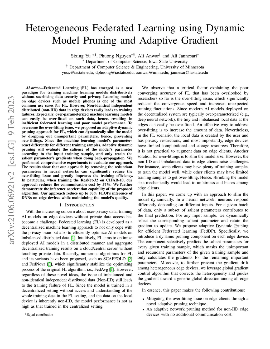 Federated Learning (FL) has emerged as a new paradigm for training machine learning models distributively without sacrificing data security and privacy. Learning models on edge devices such as mobile phones is one of the most common use cases for FL. However, Non-identical independent distributed~(non-IID) data in edge devices easily leads to training failures. Especially, over-parameterized machine learning models can easily be over-fitted on such data, hence, resulting in inefficient federated learning and poor model performance. To overcome the over-fitting issue, we proposed an adaptive dynamic pruning approach for FL, which can dynamically slim the model by dropping out unimportant parameters, hence, preventing over-fittings. Since the machine learning model's parameters react differently for different training samples, adaptive dynamic pruning will evaluate the salience of the model's parameter according to the input training sample, and only retain the salient parameter's gradients when doing back-propagation. We performed comprehensive experiments to evaluate our approach. The results show that our approach by removing the redundant parameters in neural networks can significantly reduce the over-fitting issue and greatly improves the training efficiency. In particular, when training the ResNet-32 on CIFAR-10, our approach reduces the communication cost by 57\%. We further demonstrate the inference acceleration capability of the proposed algorithm. Our approach reduces up to 50\% FLOPs inference of DNNs on edge devices while maintaining the model's quality.