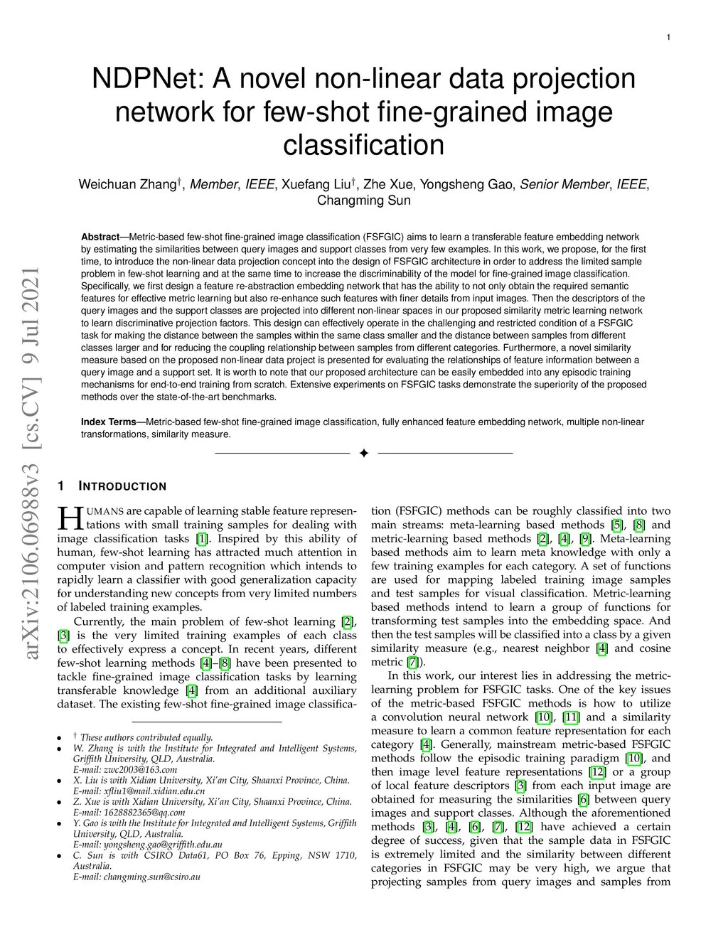 Metric-based few-shot fine-grained image classification (FSFGIC) aims to learn a transferable feature embedding network by estimating the similarities between query images and support classes from very few examples. In this work, we propose, for the first time, to introduce the non-linear data projection concept into the design of FSFGIC architecture in order to address the limited sample problem in few-shot learning and at the same time to increase the discriminability of the model for fine-grained image classification. Specifically, we first design a feature re-abstraction embedding network that has the ability to not only obtain the required semantic features for effective metric learning but also re-enhance such features with finer details from input images. Then the descriptors of the query images and the support classes are projected into different non-linear spaces in our proposed similarity metric learning network to learn discriminative projection factors. This design can effectively operate in the challenging and restricted condition of a FSFGIC task for making the distance between the samples within the same class smaller and the distance between samples from different classes larger and for reducing the coupling relationship between samples from different categories. Furthermore, a novel similarity measure based on the proposed non-linear data project is presented for evaluating the relationships of feature information between a query image and a support set. It is worth to note that our proposed architecture can be easily embedded into any episodic training mechanisms for end-to-end training from scratch. Extensive experiments on FSFGIC tasks demonstrate the superiority of the proposed methods over the state-of-the-art benchmarks.