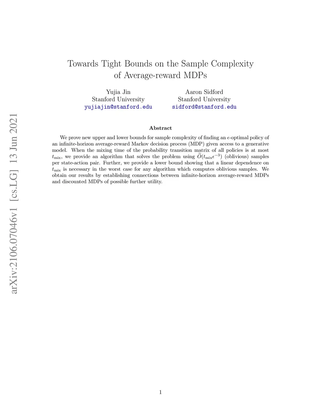 We prove new upper and lower bounds for sample complexity of finding an -optimal policy of an infinite-horizon average-reward Markov decision process (MDP) given access to a generative model. When the mixing time of the probability transition matrix of all policies is at most , we provide an algorithm that solves the problem using (oblivious) samples per state-action pair. Further, we provide a lower bound showing that a linear dependence on is necessary in the worst case for any algorithm which computes oblivious samples. We obtain our results by establishing connections between infinite-horizon average-reward MDPs and discounted MDPs of possible further utility.