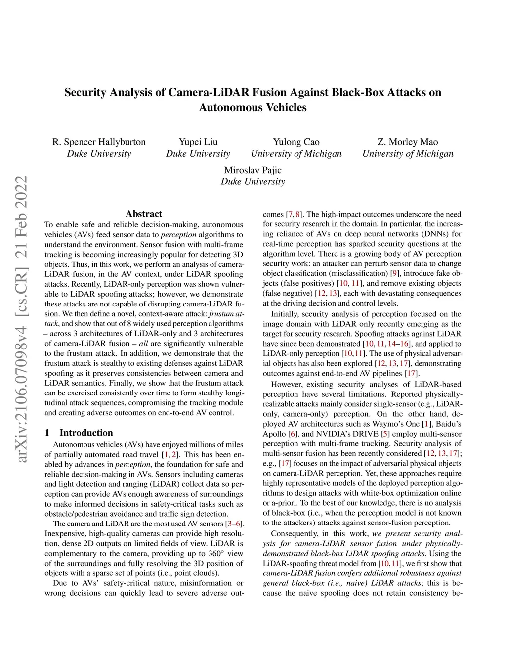 To enable safe and reliable decision-making, autonomous vehicles (AVs) feed sensor data to perception algorithms to understand the environment. Sensor fusion with multi-frame tracking is becoming increasingly popular for detecting 3D objects. Thus, in this work, we perform an analysis of camera-LiDAR fusion, in the AV context, under LiDAR spoofing attacks. Recently, LiDAR-only perception was shown vulnerable to LiDAR spoofing attacks; however, we demonstrate these attacks are not capable of disrupting camera-LiDAR fusion. We then define a novel, context-aware attack: frustum attack, and show that out of 8 widely used perception algorithms - across 3 architectures of LiDAR-only and 3 architectures of camera-LiDAR fusion - all are significantly vulnerable to the frustum attack. In addition, we demonstrate that the frustum attack is stealthy to existing defenses against LiDAR spoofing as it preserves consistencies between camera and LiDAR semantics. Finally, we show that the frustum attack can be exercised consistently over time to form stealthy longitudinal attack sequences, compromising the tracking module and creating adverse outcomes on end-to-end AV control.