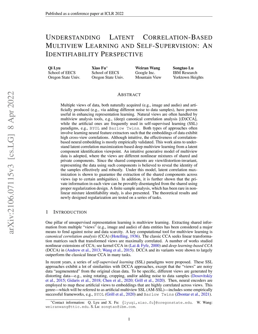Multiple views of data, both naturally acquired (e.g., image and audio) and artificially produced (e.g., via adding different noise to data samples), have proven useful in enhancing representation learning. Natural views are often handled by multiview analysis tools, e.g., (deep) canonical correlation analysis [(D)CCA], while the artificial ones are frequently used in self-supervised learning (SSL) paradigms, e.g., BYOL and Barlow Twins. Both types of approaches often involve learning neural feature extractors such that the embeddings of data exhibit high cross-view correlations. Although intuitive, the effectiveness of correlation-based neural embedding is mostly empirically validated. This work aims to understand latent correlation maximization-based deep multiview learning from a latent component identification viewpoint. An intuitive generative model of multiview data is adopted, where the views are different nonlinear mixtures of shared and private components. Since the shared components are view/distortion-invariant, representing the data using such components is believed to reveal the identity of the samples effectively and robustly. Under this model, latent correlation maximization is shown to guarantee the extraction of the shared components across views (up to certain ambiguities). In addition, it is further shown that the private information in each view can be provably disentangled from the shared using proper regularization design. A finite sample analysis, which has been rare in nonlinear mixture identifiability study, is also presented. The theoretical results and newly designed regularization are tested on a series of tasks.