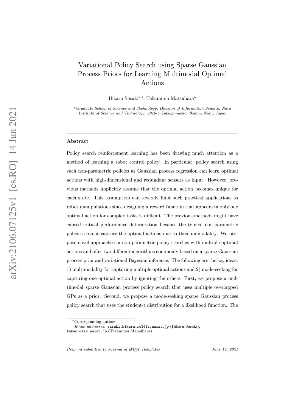Policy search reinforcement learning has been drawing much attention as a method of learning a robot control policy. In particular, policy search using such non-parametric policies as Gaussian process regression can learn optimal actions with high-dimensional and redundant sensors as input. However, previous methods implicitly assume that the optimal action becomes unique for each state. This assumption can severely limit such practical applications as robot manipulations since designing a reward function that appears in only one optimal action for complex tasks is difficult. The previous methods might have caused critical performance deterioration because the typical non-parametric policies cannot capture the optimal actions due to their unimodality. We propose novel approaches in non-parametric policy searches with multiple optimal actions and offer two different algorithms commonly based on a sparse Gaussian process prior and variational Bayesian inference. The following are the key ideas: 1) multimodality for capturing multiple optimal actions and 2) mode-seeking for capturing one optimal action by ignoring the others. First, we propose a multimodal sparse Gaussian process policy search that uses multiple overlapped GPs as a prior. Second, we propose a mode-seeking sparse Gaussian process policy search that uses the student-t distribution for a likelihood function. The effectiveness of those algorithms is demonstrated through applications to object manipulation tasks with multiple optimal actions in simulations.