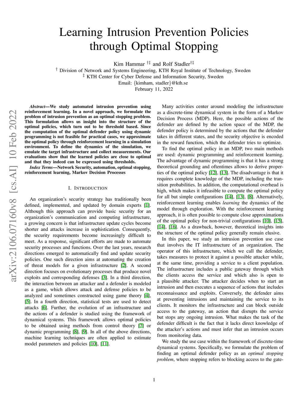 We study automated intrusion prevention using reinforcement learning. In a novel approach, we formulate the problem of intrusion prevention as an optimal stopping problem. This formulation allows us insight into the structure of the optimal policies, which turn out to be threshold based. Since the computation of the optimal defender policy using dynamic programming is not feasible for practical cases, we approximate the optimal policy through reinforcement learning in a simulation environment. To define the dynamics of the simulation, we emulate the target infrastructure and collect measurements. Our evaluations show that the learned policies are close to optimal and that they indeed can be expressed using thresholds.