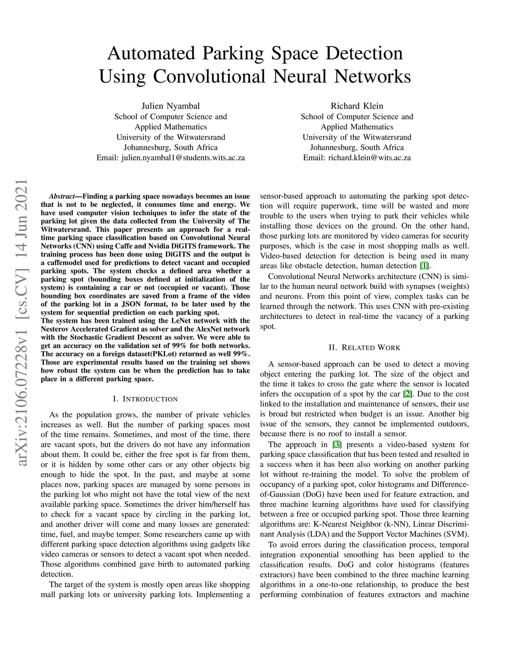 Finding a parking space nowadays becomes an issue that is not to be neglected, it consumes time and energy. We have used computer vision techniques to infer the state of the parking lot given the data collected from the University of The Witwatersrand. This paper presents an approach for a real-time parking space classification based on Convolutional Neural Networks (CNN) using Caffe and Nvidia DiGITS framework. The training process has been done using DiGITS and the output is a caffemodel used for predictions to detect vacant and occupied parking spots. The system checks a defined area whether a parking spot (bounding boxes defined at initialization of the system) is containing a car or not (occupied or vacant). Those bounding box coordinates are saved from a frame of the video of the parking lot in a JSON format, to be later used by the system for sequential prediction on each parking spot. The system has been trained using the LeNet network with the Nesterov Accelerated Gradient as solver and the AlexNet network with the Stochastic Gradient Descent as solver. We were able to get an accuracy on the validation set of 99\% for both networks. The accuracy on a foreign dataset(PKLot) returned as well 99\%. Those are experimental results based on the training set shows how robust the system can be when the prediction has to take place in a different parking space.