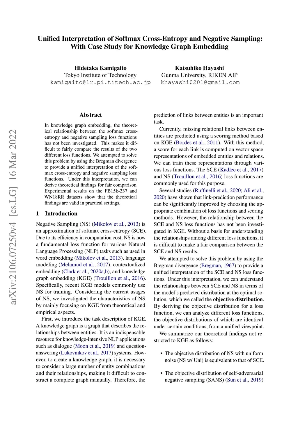 In knowledge graph embedding, the theoretical relationship between the softmax cross-entropy and negative sampling loss functions has not been investigated. This makes it difficult to fairly compare the results of the two different loss functions. We attempted to solve this problem by using the Bregman divergence to provide a unified interpretation of the softmax cross-entropy and negative sampling loss functions. Under this interpretation, we can derive theoretical findings for fair comparison. Experimental results on the FB15k-237 and WN18RR datasets show that the theoretical findings are valid in practical settings.