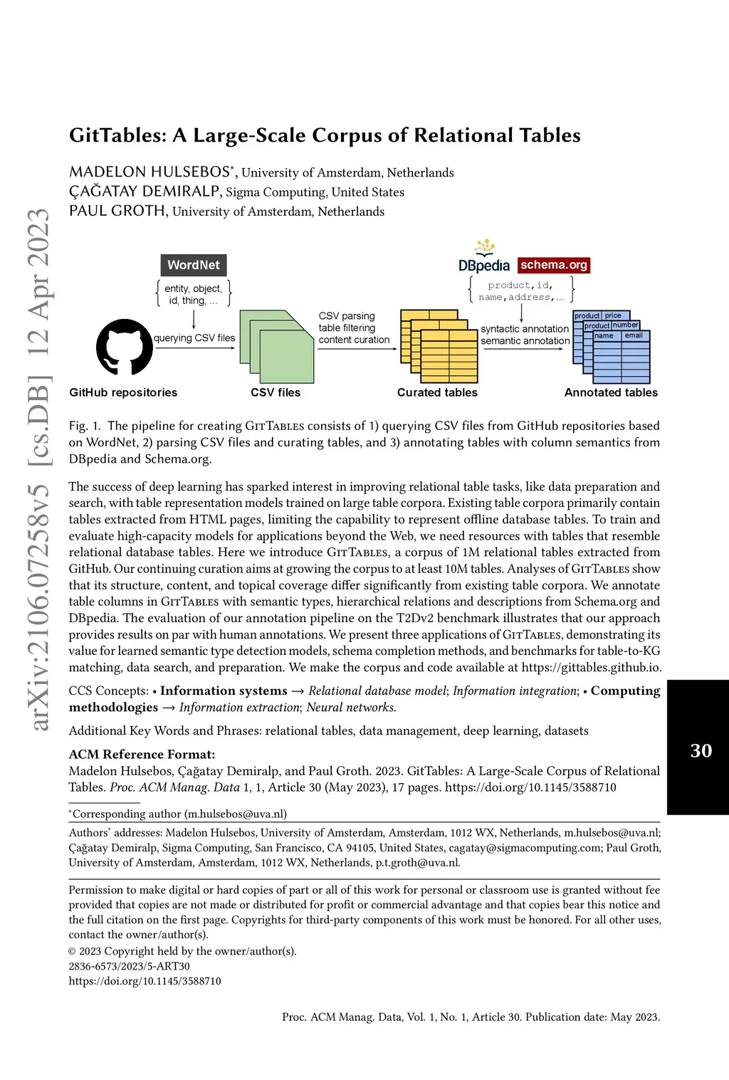 The success of deep learning has sparked interest in improving relational table tasks, like data preparation and search, with table representation models trained on large table corpora. Existing table corpora primarily contain tables extracted from HTML pages, limiting the capability to represent offline database tables. To train and evaluate high-capacity models for applications beyond the Web, we need resources with tables that resemble relational database tables. Here we introduce GitTables, a corpus of 1M relational tables extracted from GitHub. Our continuing curation aims at growing the corpus to at least 10M tables. Analyses of GitTables show that its structure, content, and topical coverage differ significantly from existing table corpora. We annotate table columns in GitTables with semantic types, hierarchical relations and descriptions from Schema.org and DBpedia. The evaluation of our annotation pipeline on the T2Dv2 benchmark illustrates that our approach provides results on par with human annotations. We present three applications of GitTables, demonstrating its value for learned semantic type detection models, schema completion methods, and benchmarks for table-to-KG matching, data search, and preparation. We make the corpus and code available at https://gittables.github.io.