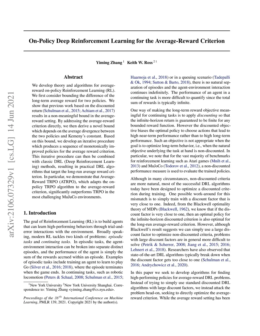 We develop theory and algorithms for average-reward on-policy Reinforcement Learning (RL). We first consider bounding the difference of the long-term average reward for two policies. We show that previous work based on the discounted return (Schulman et al., 2015; Achiam et al., 2017) results in a non-meaningful bound in the average-reward setting. By addressing the average-reward criterion directly, we then derive a novel bound which depends on the average divergence between the two policies and Kemeny's constant. Based on this bound, we develop an iterative procedure which produces a sequence of monotonically improved policies for the average reward criterion. This iterative procedure can then be combined with classic DRL (Deep Reinforcement Learning) methods, resulting in practical DRL algorithms that target the long-run average reward criterion. In particular, we demonstrate that Average-Reward TRPO (ATRPO), which adapts the on-policy TRPO algorithm to the average-reward criterion, significantly outperforms TRPO in the most challenging MuJuCo environments.