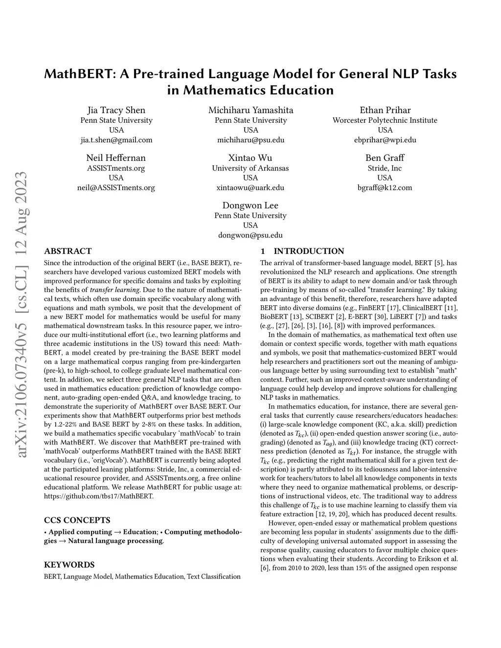 Since the introduction of the original BERT (i.e., BASE BERT), researchers have developed various customized BERT models with improved performance for specific domains and tasks by exploiting the benefits of transfer learning. Due to the nature of mathematical texts, which often use domain specific vocabulary along with equations and math symbols, we posit that the development of a new BERT model for mathematics would be useful for many mathematical downstream tasks. In this resource paper, we introduce our multi-institutional effort (i.e., two learning platforms and three academic institutions in the US) toward this need: MathBERT, a model created by pre-training the BASE BERT model on a large mathematical corpus ranging from pre-kindergarten (pre-k), to high-school, to college graduate level mathematical content. In addition, we select three general NLP tasks that are often used in mathematics education: prediction of knowledge component, auto-grading open-ended Q&A, and knowledge tracing, to demonstrate the superiority of MathBERT over BASE BERT. Our experiments show that MathBERT outperforms prior best methods by 1.2-22% and BASE BERT by 2-8% on these tasks. In addition, we build a mathematics specific vocabulary 'mathVocab' to train with MathBERT. We discover that MathBERT pre-trained with 'mathVocab' outperforms MathBERT trained with the BASE BERT vocabulary (i.e., órigVocab'). MathBERT is currently being adopted at the participated leaning platforms: Stride, Inc, a commercial educational resource provider, and ASSISTments.org, a free online educational platform. We release MathBERT for public usage at: https://github.com/tbs17/MathBERT.
