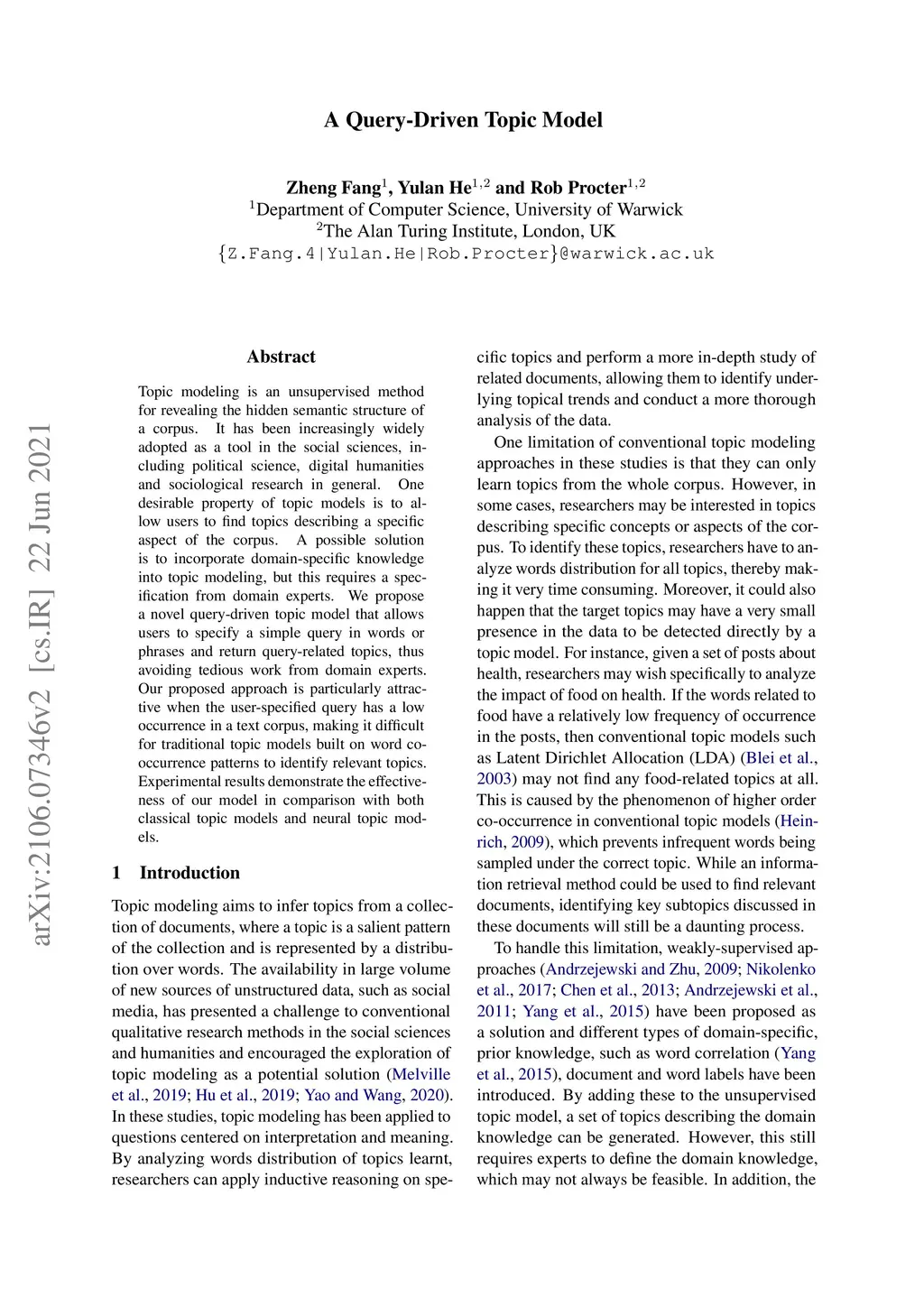 Topic modeling is an unsupervised method for revealing the hidden semantic structure of a corpus. It has been increasingly widely adopted as a tool in the social sciences, including political science, digital humanities and sociological research in general. One desirable property of topic models is to allow users to find topics describing a specific aspect of the corpus. A possible solution is to incorporate domain-specific knowledge into topic modeling, but this requires a specification from domain experts. We propose a novel query-driven topic model that allows users to specify a simple query in words or phrases and return query-related topics, thus avoiding tedious work from domain experts. Our proposed approach is particularly attractive when the user-specified query has a low occurrence in a text corpus, making it difficult for traditional topic models built on word cooccurrence patterns to identify relevant topics. Experimental results demonstrate the effectiveness of our model in comparison with both classical topic models and neural topic models.