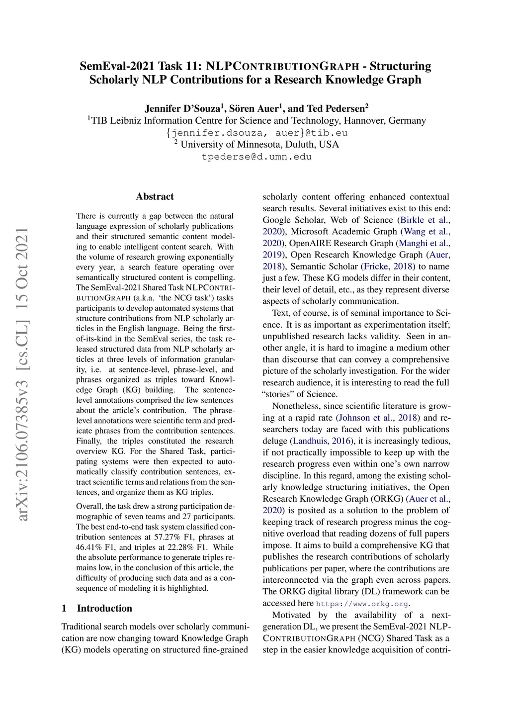There is currently a gap between the natural language expression of scholarly publications and their structured semantic content modeling to enable intelligent content search. With the volume of research growing exponentially every year, a search feature operating over semantically structured content is compelling. The SemEval-2021 Shared Task NLPContributionGraph (a.k.a. 'the NCG task') tasks participants to develop automated systems that structure contributions from NLP scholarly articles in the English language. Being the first-of-its-kind in the SemEval series, the task released structured data from NLP scholarly articles at three levels of information granularity, i.e. at sentence-level, phrase-level, and phrases organized as triples toward Knowledge Graph (KG) building. The sentence-level annotations comprised the few sentences about the article's contribution. The phrase-level annotations were scientific term and predicate phrases from the contribution sentences. Finally, the triples constituted the research overview KG. For the Shared Task, participating systems were then expected to automatically classify contribution sentences, extract scientific terms and relations from the sentences, and organize them as KG triples. Overall, the task drew a strong participation demographic of seven teams and 27 participants. The best end-to-end task system classified contribution sentences at 57.27% F1, phrases at 46.41% F1, and triples at 22.28% F1. While the absolute performance to generate triples remains low, in the conclusion of this article, the difficulty of producing such data and as a consequence of modeling it is highlighted.