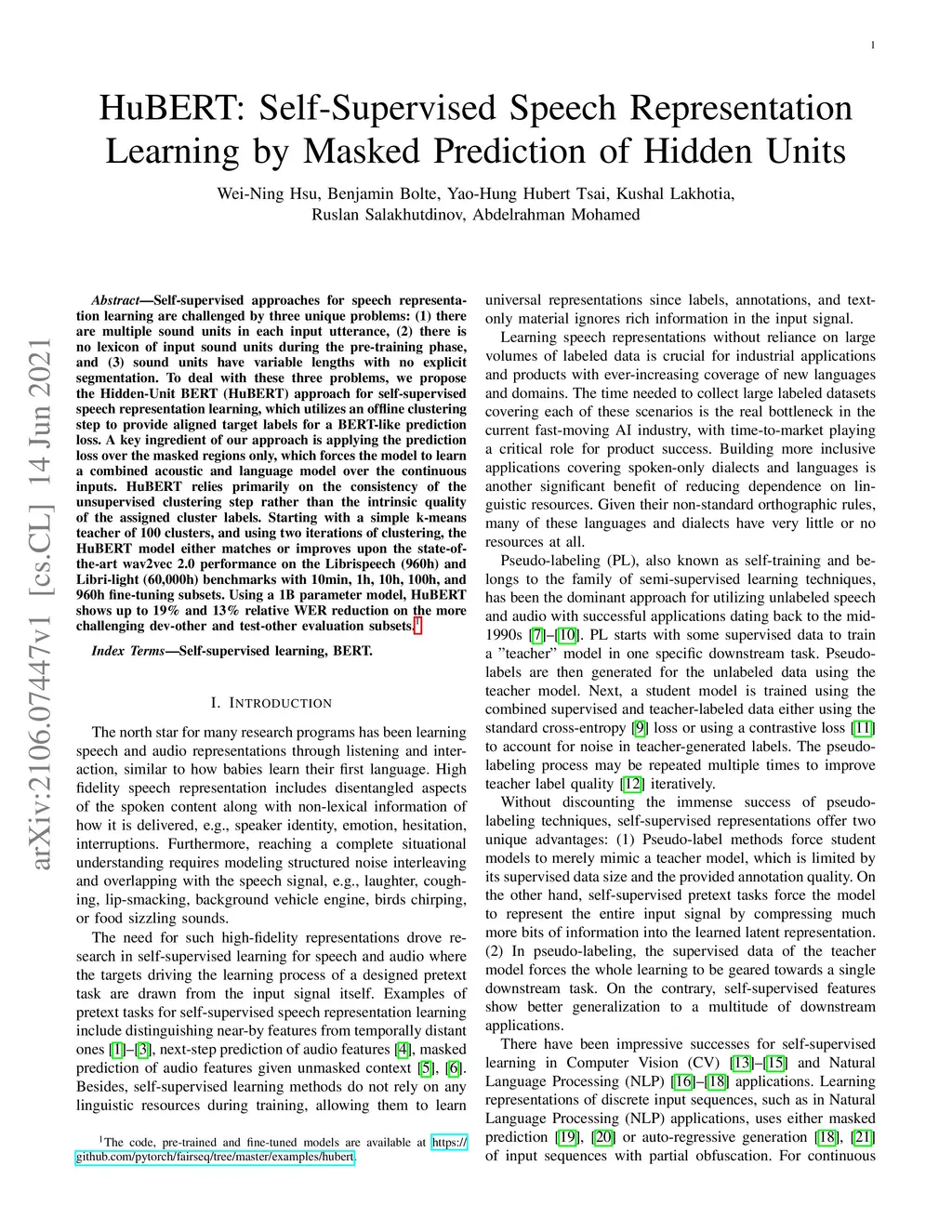 HuBERT: Self-Supervised Speech Representation Learning by Masked