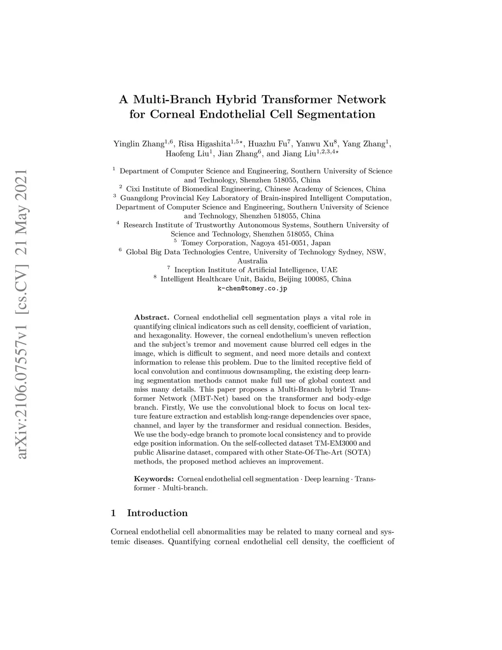 Corneal endothelial cell segmentation plays a vital role inquantifying clinical indicators such as cell density, coefficient of variation,and hexagonality. However, the corneal endothelium's uneven reflectionand the subject's tremor and movement cause blurred cell edges in theimage, which is difficult to segment, and need more details and contextinformation to release this problem. Due to the limited receptive field oflocal convolution and continuous downsampling, the existing deep learn-ing segmentation methods cannot make full use of global context andmiss many details. This paper proposes a Multi-Branch hybrid Trans-former Network (MBT-Net) based on the transformer and body-edgebranch. Firstly, We use the convolutional block to focus on local tex-ture feature extraction and establish long-range dependencies over space,channel, and layer by the transformer and residual connection. Besides,We use the body-edge branch to promote local consistency and to provideedge position information. On the self-collected dataset TM-EM3000 andpublic Alisarine dataset, compared with other State-Of-The-Art (SOTA)methods, the proposed method achieves an improvement.