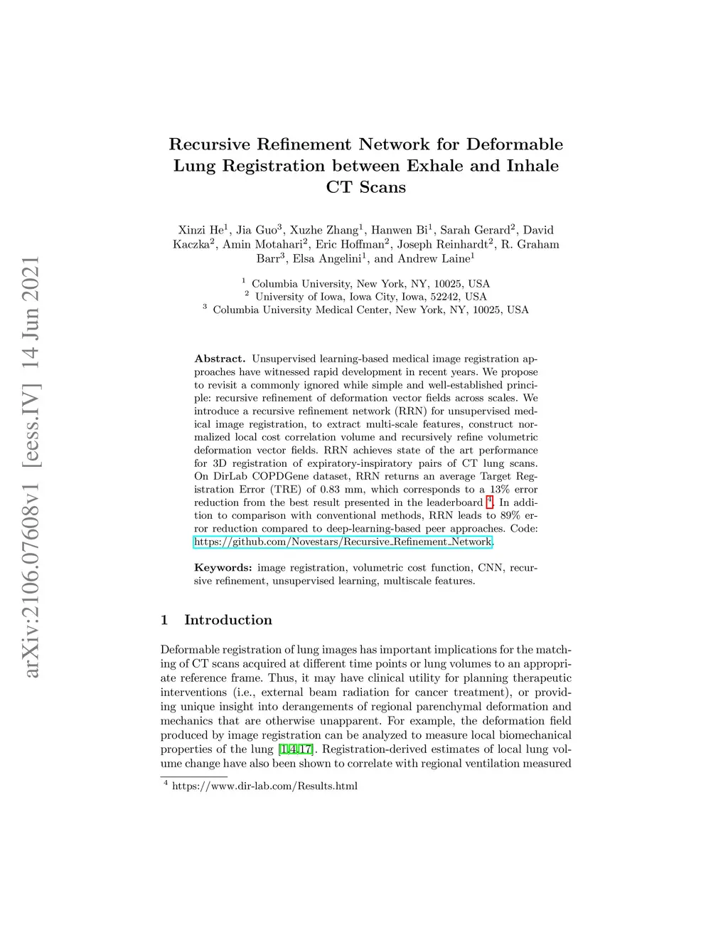 Unsupervised learning-based medical image registration approaches have witnessed rapid development in recent years. We propose to revisit a commonly ignored while simple and well-established principle: recursive refinement of deformation vector fields across scales. We introduce a recursive refinement network (RRN) for unsupervised medical image registration, to extract multi-scale features, construct normalized local cost correlation volume and recursively refine volumetric deformation vector fields. RRN achieves state of the art performance for 3D registration of expiratory-inspiratory pairs of CT lung scans. On DirLab COPDGene dataset, RRN returns an average Target Registration Error (TRE) of 0.83 mm, which corresponds to a 13% error reduction from the best result presented in the leaderboard. In addition to comparison with conventional methods, RRN leads to 89% error reduction compared to deep-learning-based peer approaches.