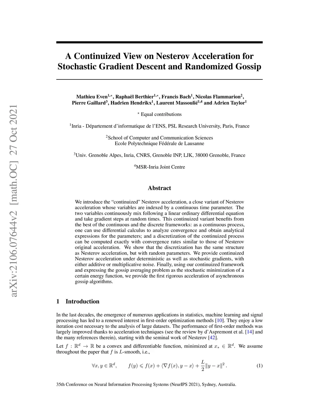 We introduce the continuized Nesterov acceleration, a close variant of Nesterov acceleration whose variables are indexed by a continuous time parameter. The two variables continuously mix following a linear ordinary differential equation and take gradient steps at random times. This continuized variant benefits from the best of the continuous and the discrete frameworks: as a continuous process, one can use differential calculus to analyze convergence and obtain analytical expressions for the parameters; and a discretization of the continuized process can be computed exactly with convergence rates similar to those of Nesterov original acceleration. We show that the discretization has the same structure as Nesterov acceleration, but with random parameters. We provide continuized Nesterov acceleration under deterministic as well as stochastic gradients, with either additive or multiplicative noise. Finally, using our continuized framework and expressing the gossip averaging problem as the stochastic minimization of a certain energy function, we provide the first rigorous acceleration of asynchronous gossip algorithms.