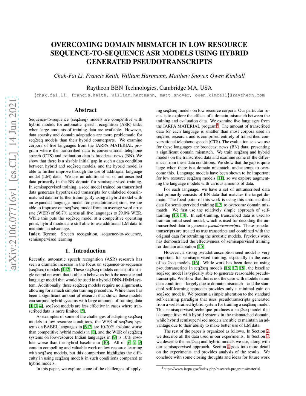Sequence-to-sequence (seq2seq) models are competitive with hybrid models for automatic speech recognition (ASR) tasks when large amounts of training data are available. However, data sparsity and domain adaptation are more problematic for seq2seq models than their hybrid counterparts. We examine corpora of five languages from the IARPA MATERIAL program where the transcribed data is conversational telephone speech (CTS) and evaluation data is broadcast news (BN). We show that there is a sizable initial gap in such a data condition between hybrid and seq2seq models, and the hybrid model is able to further improve through the use of additional language model (LM) data. We use an additional set of untranscribed data primarily in the BN domain for semisupervised training. In semisupervised training, a seed model trained on transcribed data generates hypothesized transcripts for unlabeled domain-matched data for further training. By using a hybrid model with an expanded language model for pseudotranscription, we are able to improve our seq2seq model from an average word error rate (WER) of 66.7% across all five languages to 29.0% WER. While this puts the seq2seq model at a competitive operating point, hybrid models are still able to use additional LM data to maintain an advantage.