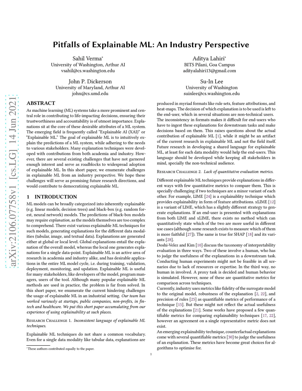 As machine learning (ML) systems take a more prominent and central role in contributing to life-impacting decisions, ensuring their trustworthiness and accountability is of utmost importance. Explanations sit at the core of these desirable attributes of a ML system. The emerging field is frequently called ``Explainable AI (XAI)'' or ``Explainable ML.'' The goal of explainable ML is to intuitively explain the predictions of a ML system, while adhering to the needs to various stakeholders. Many explanation techniques were developed with contributions from both academia and industry. However, there are several existing challenges that have not garnered enough interest and serve as roadblocks to widespread adoption of explainable ML. In this short paper, we enumerate challenges in explainable ML from an industry perspective. We hope these challenges will serve as promising future research directions, and would contribute to democratizing explainable ML.