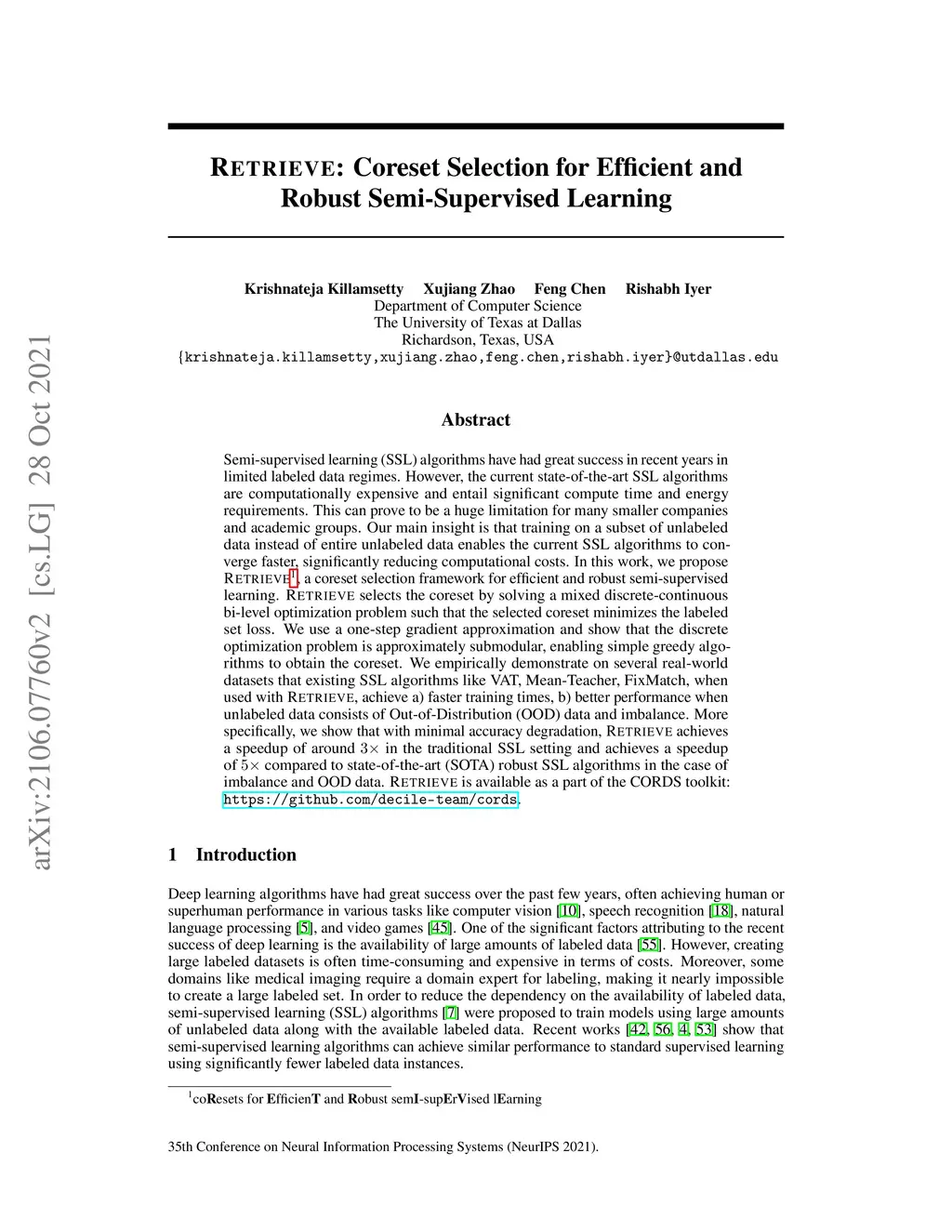 Semi-supervised learning (SSL) algorithms have had great success in recent years in limited labeled data regimes. However, the current state-of-the-art SSL algorithms are computationally expensive and entail significant compute time and energy requirements. This can prove to be a huge limitation for many smaller companies and academic groups. Our main insight is that training on a subset of unlabeled data instead of entire unlabeled data enables the current SSL algorithms to converge faster, significantly reducing computational costs. In this work, we propose RETRIEVE, a coreset selection framework for efficient and robust semi-supervised learning. RETRIEVE selects the coreset by solving a mixed discrete-continuous bi-level optimization problem such that the selected coreset minimizes the labeled set loss. We use a one-step gradient approximation and show that the discrete optimization problem is approximately submodular, enabling simple greedy algorithms to obtain the coreset. We empirically demonstrate on several real-world datasets that existing SSL algorithms like VAT, Mean-Teacher, FixMatch, when used with RETRIEVE, achieve a) faster training times, b) better performance when unlabeled data consists of Out-of-Distribution (OOD) data and imbalance. More specifically, we show that with minimal accuracy degradation, RETRIEVE achieves a speedup of around in the traditional SSL setting and achieves a speedup of compared to state-of-the-art (SOTA) robust SSL algorithms in the case of imbalance and OOD data. RETRIEVE is available as a part of the CORDS toolkit: https://github.com/decile-team/cords.