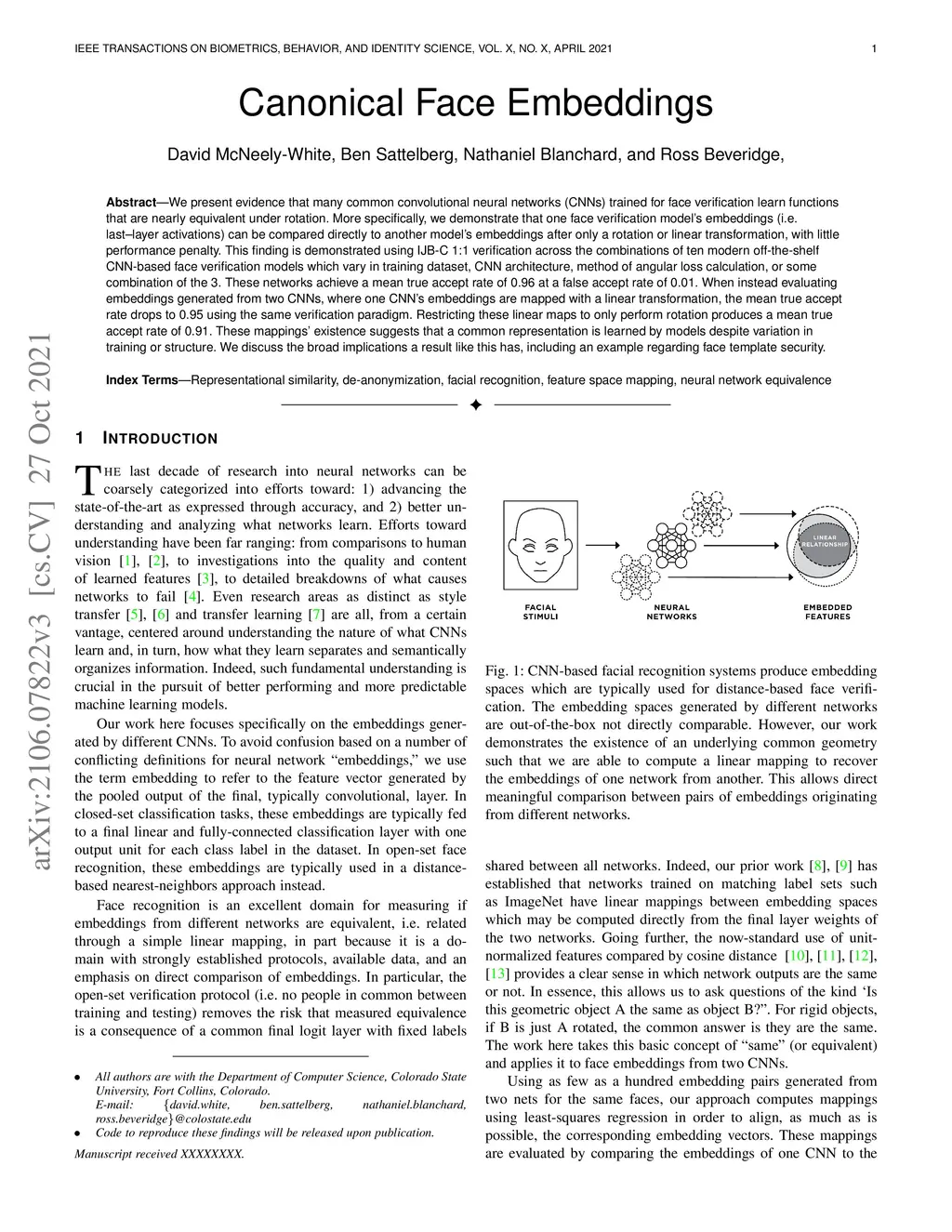 We present evidence that many common convolutional neural networks (CNNs) trained for face verification learn functions that are nearly equivalent under rotation. More specifically, we demonstrate that one face verification model's embeddings (i.e. last-layer activations) can be compared directly to another model's embeddings after only a rotation or linear transformation, with little performance penalty. This finding is demonstrated using IJB-C 1:1 verification across the combinations of ten modern off-the-shelf CNN-based face verification models which vary in training dataset, CNN architecture, method of angular loss calculation, or some combination of the 3. These networks achieve a mean true accept rate of 0.96 at a false accept rate of 0.01. When instead evaluating embeddings generated from two CNNs, where one CNN's embeddings are mapped with a linear transformation, the mean true accept rate drops to 0.95 using the same verification paradigm. Restricting these linear maps to only perform rotation produces a mean true accept rate of 0.91. These mappings' existence suggests that a common representation is learned by models despite variation in training or structure. We discuss the broad implications a result like this has, including an example regarding face template security.