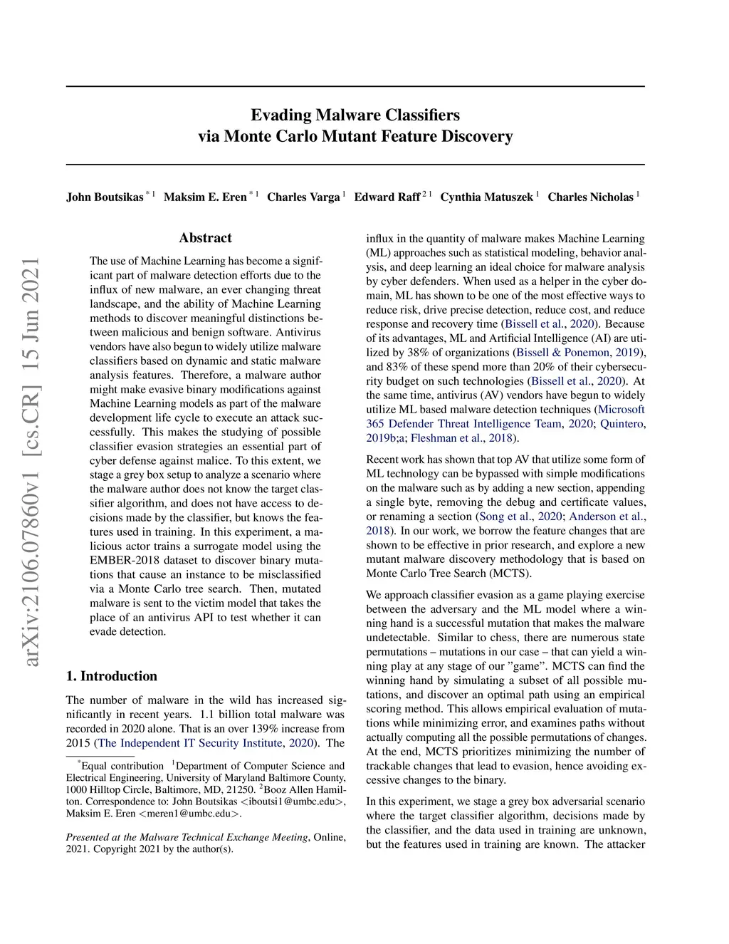 The use of Machine Learning has become a significant part of malware detection efforts due to the influx of new malware, an ever changing threat landscape, and the ability of Machine Learning methods to discover meaningful distinctions between malicious and benign software. Antivirus vendors have also begun to widely utilize malware classifiers based on dynamic and static malware analysis features. Therefore, a malware author might make evasive binary modifications against Machine Learning models as part of the malware development life cycle to execute an attack successfully. This makes the studying of possible classifier evasion strategies an essential part of cyber defense against malice. To this extent, we stage a grey box setup to analyze a scenario where the malware author does not know the target classifier algorithm, and does not have access to decisions made by the classifier, but knows the features used in training. In this experiment, a malicious actor trains a surrogate model using the EMBER-2018 dataset to discover binary mutations that cause an instance to be misclassified via a Monte Carlo tree search. Then, mutated malware is sent to the victim model that takes the place of an antivirus API to test whether it can evade detection.