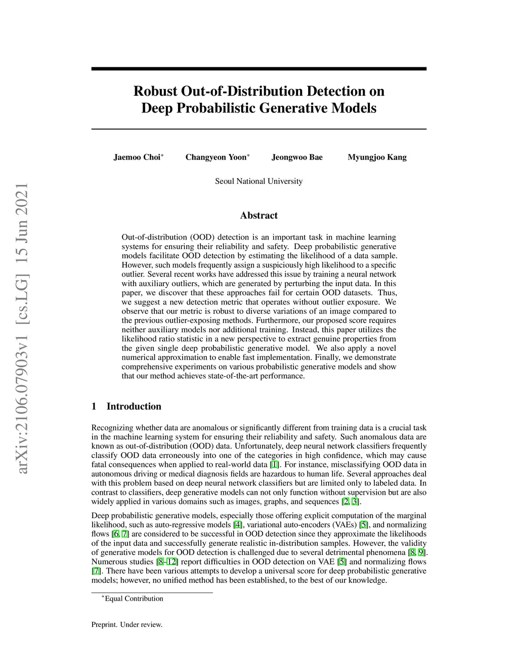 Out-of-distribution (OOD) detection is an important task in machine learning systems for ensuring their reliability and safety. Deep probabilistic generative models facilitate OOD detection by estimating the likelihood of a data sample. However, such models frequently assign a suspiciously high likelihood to a specific outlier. Several recent works have addressed this issue by training a neural network with auxiliary outliers, which are generated by perturbing the input data. In this paper, we discover that these approaches fail for certain OOD datasets. Thus, we suggest a new detection metric that operates without outlier exposure. We observe that our metric is robust to diverse variations of an image compared to the previous outlier-exposing methods. Furthermore, our proposed score requires neither auxiliary models nor additional training. Instead, this paper utilizes the likelihood ratio statistic in a new perspective to extract genuine properties from the given single deep probabilistic generative model. We also apply a novel numerical approximation to enable fast implementation. Finally, we demonstrate comprehensive experiments on various probabilistic generative models and show that our method achieves state-of-the-art performance.