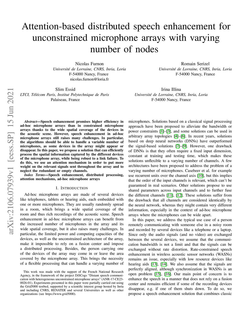 Speech enhancement promises higher efficiency in ad-hoc microphone arrays than in constrained microphone arrays thanks to the wide spatial coverage of the devices in the acoustic scene. However, speech enhancement in ad-hoc microphone arrays still raises many challenges. In particular, the algorithms should be able to handle a variable number of microphones, as some devices in the array might appear or disappear. In this paper, we propose a solution that can efficiently process the spatial information captured by the different devices of the microphone array, while being robust to a link failure. To do this, we use an attention mechanism in order to put more weight on the relevant signals sent throughout the array and to neglect the redundant or empty channels.