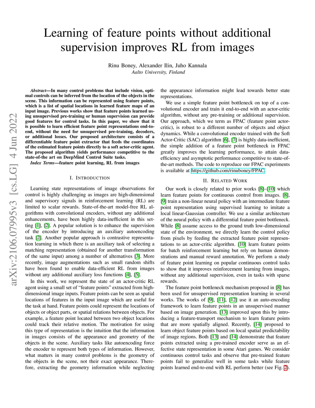 In many control problems that include vision, optimal controls can be inferred from the location of the objects in the scene. This information can be represented using feature points, which is a list of spatial locations in learned feature maps of an input image. Previous works show that feature points learned using unsupervised pre-training or human supervision can provide good features for control tasks. In this paper, we show that it is possible to learn efficient feature point representations end-to-end, without the need for unsupervised pre-training, decoders, or additional losses. Our proposed architecture consists of a differentiable feature point extractor that feeds the coordinates of the estimated feature points directly to a soft actor-critic agent. The proposed algorithm yields performance competitive to the state-of-the art on DeepMind Control Suite tasks.