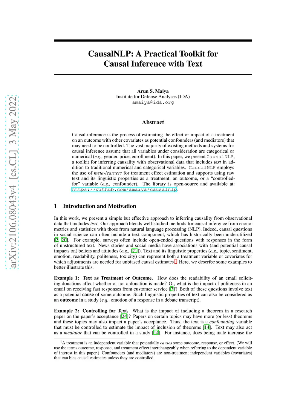 Causal inference is the process of estimating the effect or impact of a treatment on an outcome with other covariates as potential confounders (and mediators) that may need to be controlled. The vast majority of existing methods and systems for causal inference assume that all variables under consideration are categorical or numerical (e.g., gender, price, enrollment). In this paper, we present CausalNLP, a toolkit for inferring causality with observational data that includes text in addition to traditional numerical and categorical variables. CausalNLP employs the use of meta learners for treatment effect estimation and supports using raw text and its linguistic properties as a treatment, an outcome, or a "controlled-for" variable (e.g., confounder). The library is open source and available at: https://github.com/amaiya/causalnlp.