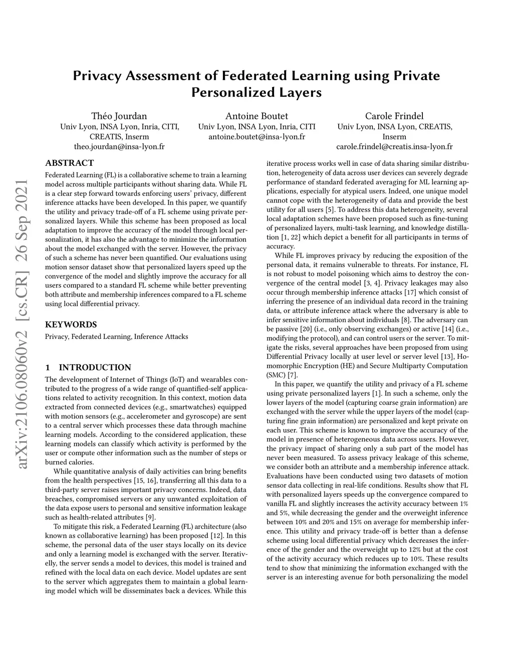 Federated Learning (FL) is a collaborative scheme to train a learning model across multiple participants without sharing data. While FL is a clear step forward towards enforcing users' privacy, different inference attacks have been developed. In this paper, we quantify the utility and privacy trade-off of a FL scheme using private personalized layers. While this scheme has been proposed as local adaptation to improve the accuracy of the model through local personalization, it has also the advantage to minimize the information about the model exchanged with the server. However, the privacy of such a scheme has never been quantified. Our evaluations using motion sensor dataset show that personalized layers speed up the convergence of the model and slightly improve the accuracy for all users compared to a standard FL scheme while better preventing both attribute and membership inferences compared to a FL scheme using local differential privacy.