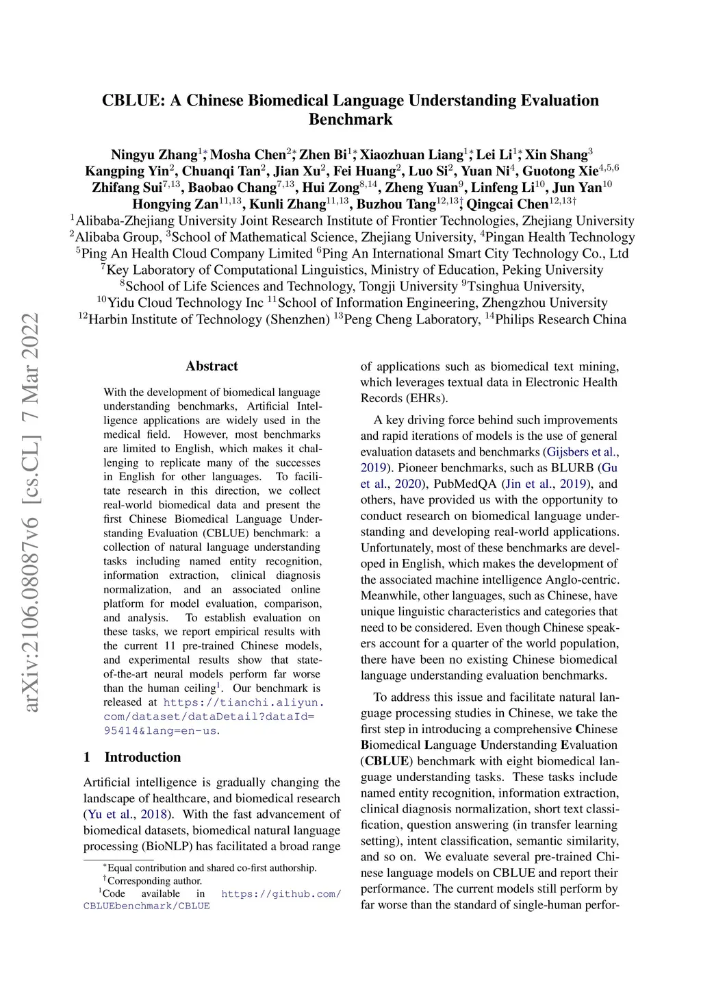 Artificial Intelligence (AI), along with the recent progress in biomedical language understanding, is gradually changing medical practice. With the development of biomedical language understanding benchmarks, AI applications are widely used in the medical field. However, most benchmarks are limited to English, which makes it challenging to replicate many of the successes in English for other languages. To facilitate research in this direction, we collect real-world biomedical data and present the first Chinese Biomedical Language Understanding Evaluation (CBLUE) benchmark: a collection of natural language understanding tasks including named entity recognition, information extraction, clinical diagnosis normalization, single-sentence/sentence-pair classification, and an associated online platform for model evaluation, comparison, and analysis. To establish evaluation on these tasks, we report empirical results with the current 11 pre-trained Chinese models, and experimental results show that state-of-the-art neural models perform by far worse than the human ceiling. Our benchmark is released at \url{https://tianchi.aliyun.com/dataset/dataDetail?dataId=95414&lang=en-us}.