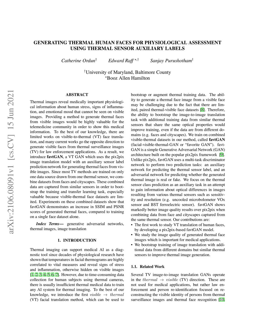 Thermal images reveal medically important physiological information about human stress, signs of inflammation, and emotional mood that cannot be seen on visible images. Providing a method to generate thermal faces from visible images would be highly valuable for the telemedicine community in order to show this medical information. To the best of our knowledge, there are limited works on visible-to-thermal (VT) face translation, and many current works go the opposite direction to generate visible faces from thermal surveillance images (TV) for law enforcement applications. As a result, we introduce favtGAN, a VT GAN which uses the pix2pix image translation model with an auxiliary sensor label prediction network for generating thermal faces from visible images. Since most TV methods are trained on only one data source drawn from one thermal sensor, we combine datasets from faces and cityscapes. These combined data are captured from similar sensors in order to bootstrap the training and transfer learning task, especially valuable because visible-thermal face datasets are limited. Experiments on these combined datasets show that favtGAN demonstrates an increase in SSIM and PSNR scores of generated thermal faces, compared to training on a single face dataset alone.