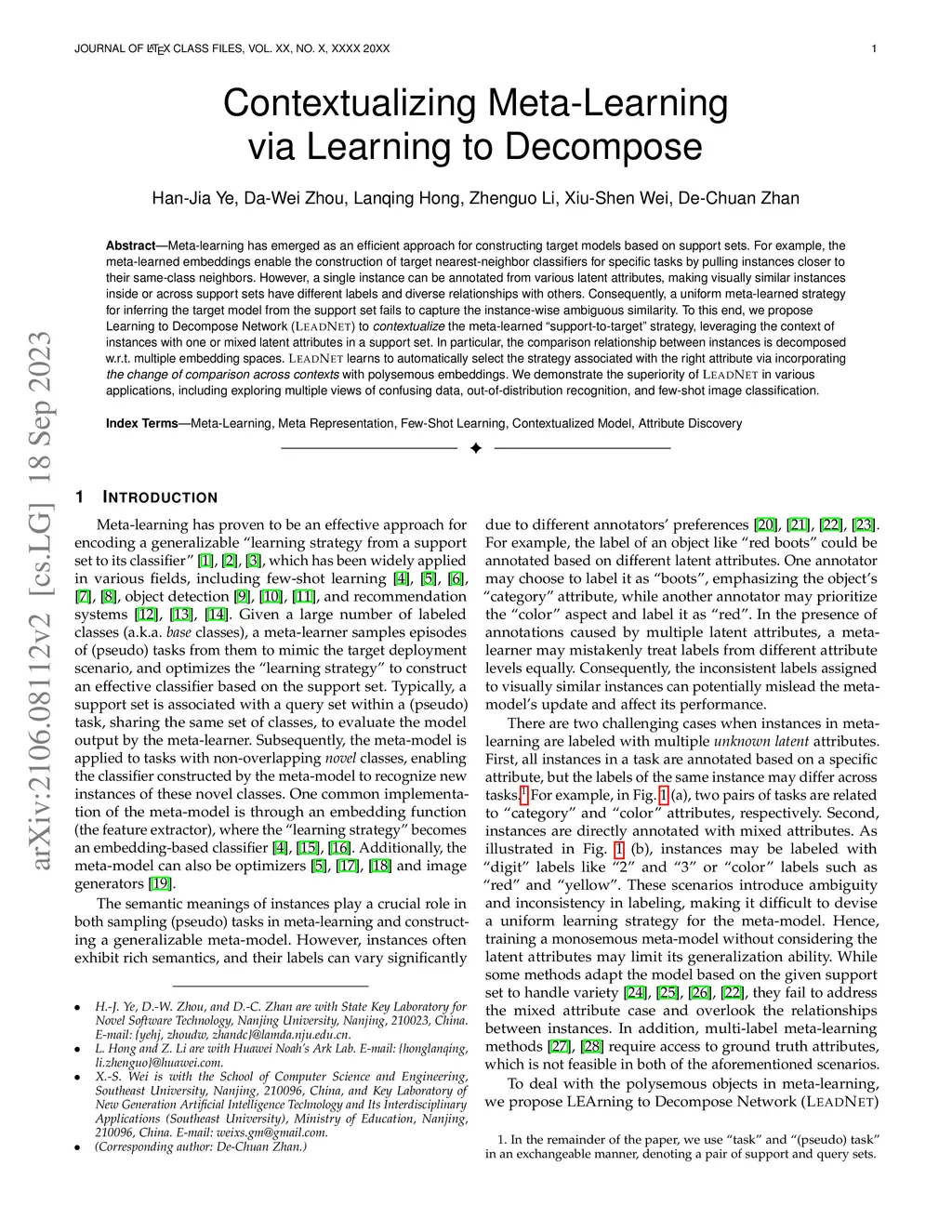 Meta-learning has emerged as an efficient approach for constructing target models based on support sets. For example, the meta-learned embeddings enable the construction of target nearest-neighbor classifiers for specific tasks by pulling instances closer to their same-class neighbors. However, a single instance can be annotated from various latent attributes, making visually similar instances inside or across support sets have different labels and diverse relationships with others. Consequently, a uniform meta-learned strategy for inferring the target model from the support set fails to capture the instance-wise ambiguous similarity. To this end, we propose Learning to Decompose Network (LeadNet) to contextualize the meta-learned ``support-to-target'' strategy, leveraging the context of instances with one or mixed latent attributes in a support set. In particular, the comparison relationship between instances is decomposed w.r.t. multiple embedding spaces. LeadNet learns to automatically select the strategy associated with the right attribute via incorporating the change of comparison across contexts} with polysemous embeddings. We demonstrate the superiority of LeadNet in various applications, including exploring multiple views of confusing data, out-of-distribution recognition, and few-shot image classification.