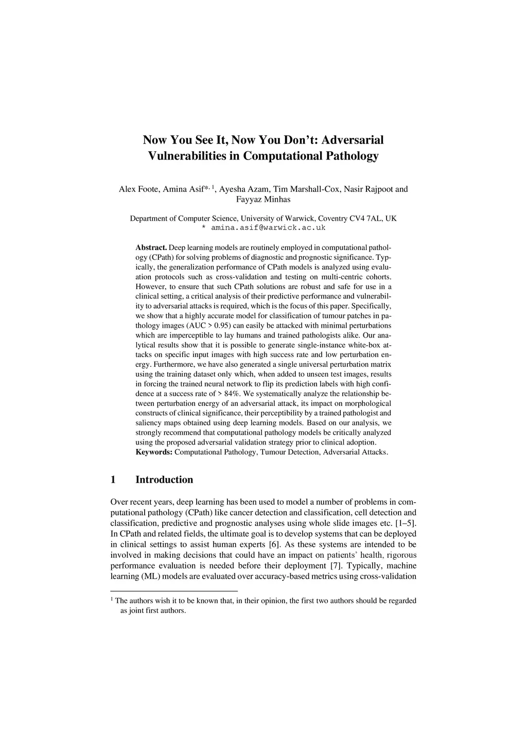 Deep learning models are routinely employed in computational pathology (CPath) for solving problems of diagnostic and prognostic significance. Typically, the generalization performance of CPath models is analyzed using evaluation protocols such as cross-validation and testing on multi-centric cohorts. However, to ensure that such CPath solutions are robust and safe for use in a clinical setting, a critical analysis of their predictive performance and vulnerability to adversarial attacks is required, which is the focus of this paper. Specifically, we show that a highly accurate model for classification of tumour patches in pathology images (AUC > 0.95) can easily be attacked with minimal perturbations which are imperceptible to lay humans and trained pathologists alike. Our analytical results show that it is possible to generate single-instance white-box attacks on specific input images with high success rate and low perturbation energy. Furthermore, we have also generated a single universal perturbation matrix using the training dataset only which, when added to unseen test images, results in forcing the trained neural network to flip its prediction labels with high confidence at a success rate of > 84%. We systematically analyze the relationship between perturbation energy of an adversarial attack, its impact on morphological constructs of clinical significance, their perceptibility by a trained pathologist and saliency maps obtained using deep learning models. Based on our analysis, we strongly recommend that computational pathology models be critically analyzed using the proposed adversarial validation strategy prior to clinical adoption.