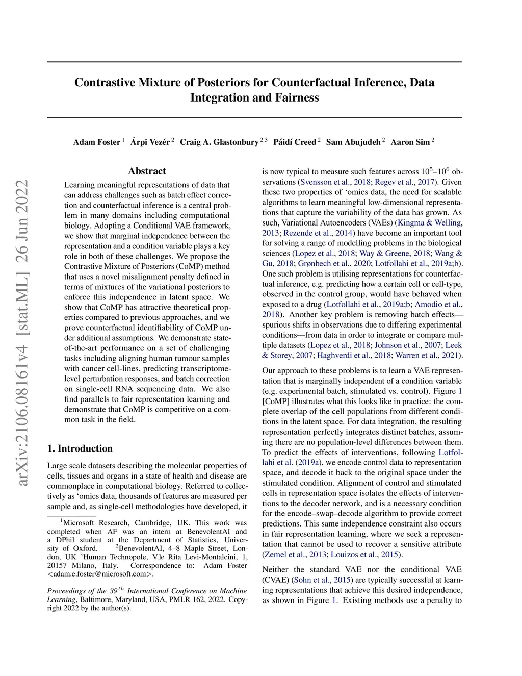 Learning meaningful representations of data that can address challenges such as batch effect correction and counterfactual inference is a central problem in many domains including computational biology. Adopting a Conditional VAE framework, we show that marginal independence between the representation and a condition variable plays a key role in both of these challenges. We propose the Contrastive Mixture of Posteriors (CoMP) method that uses a novel misalignment penalty defined in terms of mixtures of the variational posteriors to enforce this independence in latent space. We show that CoMP has attractive theoretical properties compared to previous approaches, and we prove counterfactual identifiability of CoMP under additional assumptions. We demonstrate state-of-the-art performance on a set of challenging tasks including aligning human tumour samples with cancer cell-lines, predicting transcriptome-level perturbation responses, and batch correction on single-cell RNA sequencing data. We also find parallels to fair representation learning and demonstrate that CoMP is competitive on a common task in the field.