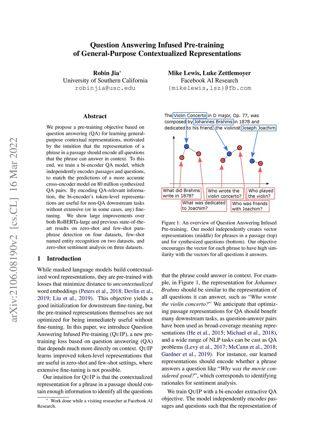 We propose a pre-training objective based on question answering (QA) for learning general-purpose contextual representations, motivated by the intuition that the representation of a phrase in a passage should encode all questions that the phrase can answer in context. To this end, we train a bi-encoder QA model, which independently encodes passages and questions, to match the predictions of a more accurate cross-encoder model on 80 million synthesized QA pairs. By encoding QA-relevant information, the bi-encoder's token-level representations are useful for non-QA downstream tasks without extensive (or in some cases, any) fine-tuning. We show large improvements over both RoBERTa-large and previous state-of-the-art results on zero-shot and few-shot paraphrase detection on four datasets, few-shot named entity recognition on two datasets, and zero-shot sentiment analysis on three datasets.