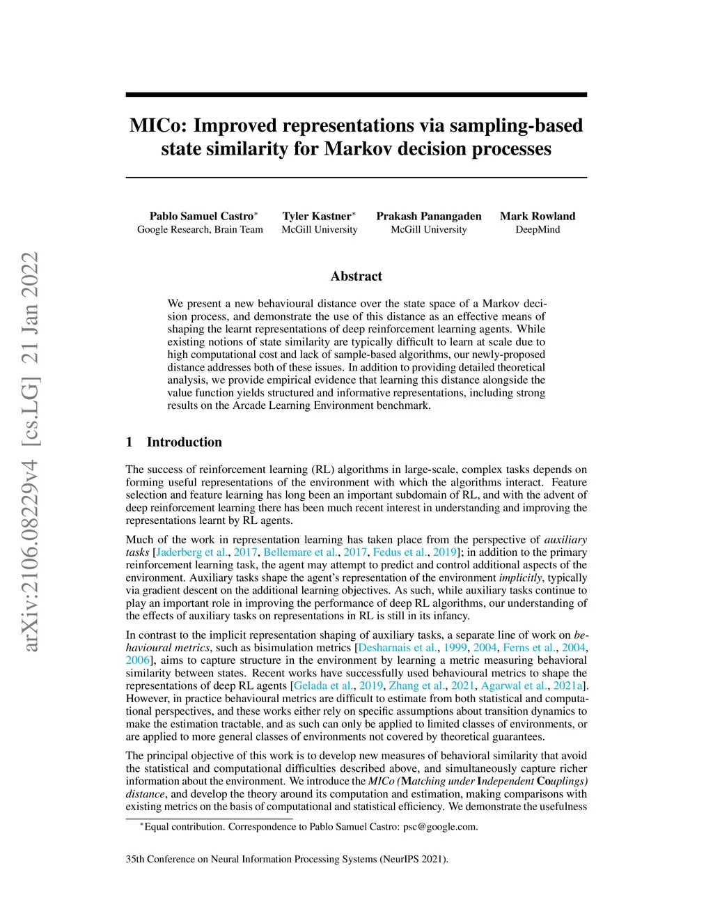 We present a new behavioural distance over the state space of a Markov decision process, and demonstrate the use of this distance as an effective means of shaping the learnt representations of deep reinforcement learning agents. While existing notions of state similarity are typically difficult to learn at scale due to high computational cost and lack of sample-based algorithms, our newly-proposed distance addresses both of these issues. In addition to providing detailed theoretical analysis, we provide empirical evidence that learning this distance alongside the value function yields structured and informative representations, including strong results on the Arcade Learning Environment benchmark.