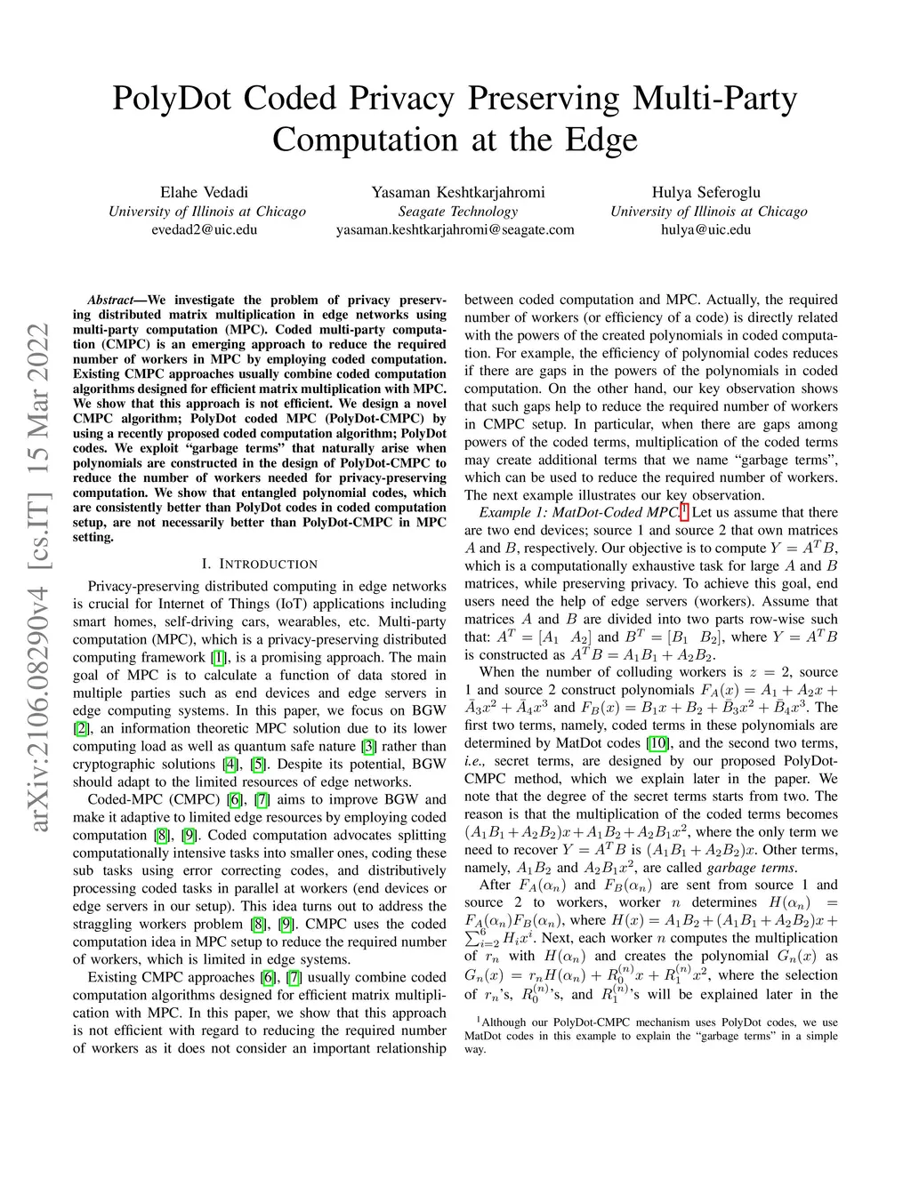 We investigate the problem of privacy preserving distributed matrix multiplication in edge networks using multi-party computation (MPC). Coded multi-party computation (CMPC) is an emerging approach to reduce the required number of workers in MPC by employing coded computation. Existing CMPC approaches usually combine coded computation algorithms designed for efficient matrix multiplication with MPC. We show that this approach is not efficient. We design a novel CMPC algorithm; PolyDot coded MPC (PolyDot-CMPC) by using a recently proposed coded computation algorithm; PolyDot codes. We exploit "garbage terms" that naturally arise when polynomials are constructed in the design of PolyDot-CMPC to reduce the number of workers needed for privacy-preserving computation. We show that entangled polynomial codes, which are consistently better than PolyDot codes in coded computation setup, are not necessarily better than PolyDot-CMPC in MPC setting.