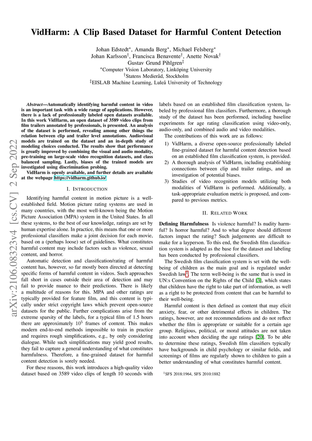 Automatically identifying harmful content in video is an important task with a wide range of applications. However, there is a lack of professionally labeled open datasets available. In this work VidHarm, an open dataset of 3589 video clips from film trailers annotated by professionals, is presented. An analysis of the dataset is performed, revealing among other things the relation between clip and trailer level annotations. Audiovisual models are trained on the dataset and an in-depth study of modeling choices conducted. The results show that performance is greatly improved by combining the visual and audio modality, pre-training on large-scale video recognition datasets, and class balanced sampling. Lastly, biases of the trained models are investigated using discrimination probing. VidHarm is openly available, and further details are available at: https://vidharm.github.io