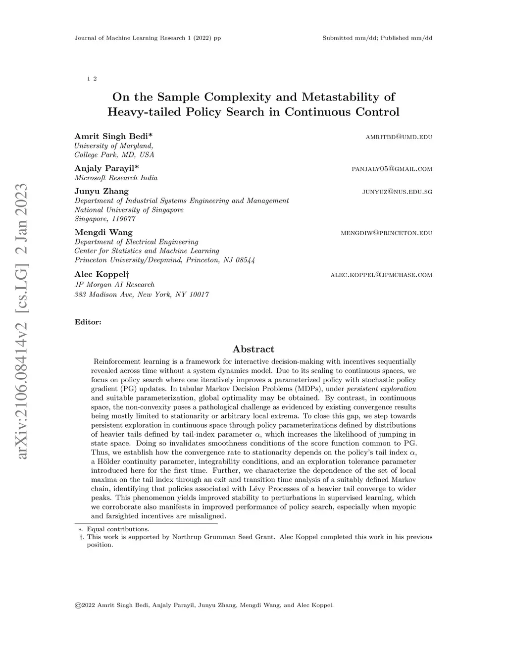 Reinforcement learning is a framework for interactive decision-making with incentives sequentially revealed across time without a system dynamics model. Due to its scaling to continuous spaces, we focus on policy search where one iteratively improves a parameterized policy with stochastic policy gradient (PG) updates. In tabular Markov Decision Problems (MDPs), under persistent exploration and suitable parameterization, global optimality may be obtained. By contrast, in continuous space, the non-convexity poses a pathological challenge as evidenced by existing convergence results being mostly limited to stationarity or arbitrary local extrema. To close this gap, we step towards persistent exploration in continuous space through policy parameterizations defined by distributions of heavier tails defined by tail-index parameter alpha, which increases the likelihood of jumping in state space. Doing so invalidates smoothness conditions of the score function common to PG. Thus, we establish how the convergence rate to stationarity depends on the policy's tail index alpha, a Holder continuity parameter, integrability conditions, and an exploration tolerance parameter introduced here for the first time. Further, we characterize the dependence of the set of local maxima on the tail index through an exit and transition time analysis of a suitably defined Markov chain, identifying that policies associated with Levy Processes of a heavier tail converge to wider peaks. This phenomenon yields improved stability to perturbations in supervised learning, which we corroborate also manifests in improved performance of policy search, especially when myopic and farsighted incentives are misaligned.