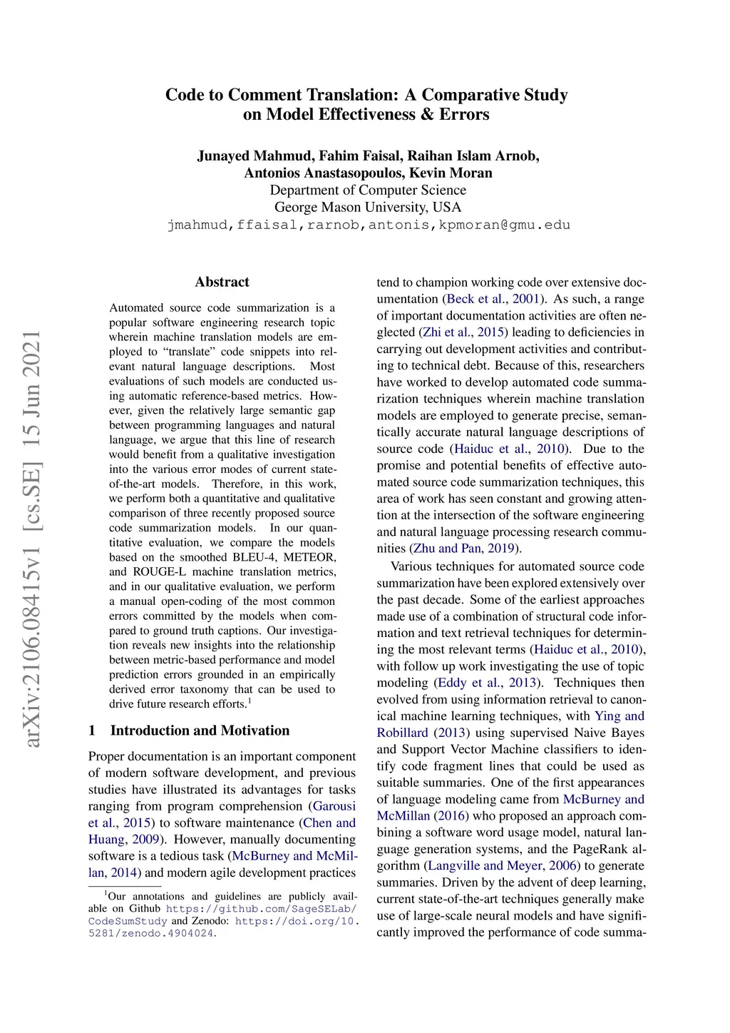 Automated source code summarization is a popular software engineering research topic wherein machine translation models are employed to "translate" code snippets into relevant natural language descriptions. Most evaluations of such models are conducted using automatic reference-based metrics. However, given the relatively large semantic gap between programming languages and natural language, we argue that this line of research would benefit from a qualitative investigation into the various error modes of current state-of-the-art models. Therefore, in this work, we perform both a quantitative and qualitative comparison of three recently proposed source code summarization models. In our quantitative evaluation, we compare the models based on the smoothed BLEU-4, METEOR, and ROUGE-L machine translation metrics, and in our qualitative evaluation, we perform a manual open-coding of the most common errors committed by the models when compared to ground truth captions. Our investigation reveals new insights into the relationship between metric-based performance and model prediction errors grounded in an empirically derived error taxonomy that can be used to drive future research efforts